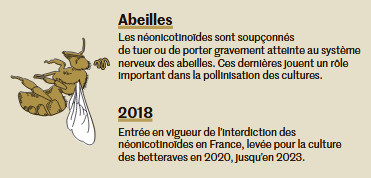 Extraits de l'article du Monde : "Rien qu’en France, 56 millions de ces hyménoptères meurent chaque jour, empoisonnés par les pesticides, herbicides, insecticides et autres néonicotinoïdes – dont une cuillerée peut tuer 1 milliard d’abeilles, souligne le commentaire." " A beaucoup plus grande échelle, le cas de la Californie et de son million d’hectares d’amandiers est périodiquement cité. Pour en assurer la pollinisation, les producteurs, soutenus par les grandes sociétés de l’agrochimie, font venir chaque année 2 milliards de ruches, soit le tiers des abeilles du pays. Les apiculteurs-loueurs iront ensuite proposer les services de leurs abeilles au Texas, puis dans le Dakota du Nord. Un transport que l’industrie de l’amande paye 400 millions de dollars par an." "Solution technologique encore, en France, où l’Institut technique et scientifique de l’apiculture puce des abeilles pour établir à partir de quelle dose de pesticide elles ne retrouvent plus le chemin de leur ruche. A contrario, certains acteurs de la filière mettent en avant les bienfaits de la présence d’abeilles pour inciter à les protéger. En France, le CNRS a établi que la pollinisation de parcelles de tournesols par les abeilles permet un gain en rentabilité de 160 euros à l’hectare." "l’Union européenne n’interdit pour l’instant que trois néonicotinoïdes. « Nous les chercheurs, on a fait le job [en démontrant les dangers des pesticides et des néonicotinoïdes], les apiculteurs ont fait le job : aux décideurs d’assumer », interpelle Jean-Marc Bonmatin, du CNRS."