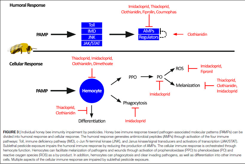 1) Les pesticides sont bien connus depuis longtemps, par exemple un insecticide, le carbaryl utilisé en 1967 sur le coton qui a provoqué la mort de 70 000 colonies d'abeilles en Californie et 33 000 dans l'Etat de Washington. Plus récemment, les néonidotinoïdes sont bien sûr accusés, mais les firmes agrochimiques dépensent des sommes considérables pour déconsidérer les travaux accusateurs et pratiquent un lobbying intensif pour reculer l’interdiction de leurs poisons (voir (Nicolino and Veillerette 2007; Foucart 2013, 2019) – le scandale n’est pas seulement français !). Pourtant, de plus en plus de données montrent que les pesticides à doses infinitésimales agissent avec retard par exemple en affaiblissant le système immunitaire des abeilles. On sait que l’abeille (comme la fourmi) bénéficie de la vie en société pour se défendre contre des attaques de pathogènes (bactéries, virus, parasites, toxiques) grâce à divers comportements hygiéniques. En conséquence, l’évolution a éliminé un certain nombre de gènes de défense immunitaire moins utiles pour ces insectes, et cela a été confirmé par le séquençage du génome de l’abeille (The honey bee genome consortium 2006). Parmi ces gènes on trouve les cytochromes P450 monooxygénases (P450s) efficaces dans la détoxification des xénobiotiques. La plupart des insectes en ont 80 ou plus alors que l’abeille en a seulement 46. C’est ainsi que les acaricides (contre le varroa) comme le coumaphos et le fluvinate peuvent être détoxifiés par trois enzymes (Mao et al. 2013). Même si une étude de l’AFSSA en février 2008 (Faucon et al. 2008) « disculpe » ces pesticides en privilégiant la piste des autres causes comme les maladies et la gestion des cheptels (sic !), les pesticides restent un élément déterminant. L’imidaclopride réduit de 85% la production de nouvelles reines chez les bourdons et le poids des ruches est de 8 à 12% plus faible (Whitehorn et al. 2012). Chez l’abeille, les butineuses marquées avec des RFID et traitées au cruiser (thiamétoxane) se perdent plus souvent (en moyenne 30%; jusqu’à 43% vs 17% chez contrôles) (Henry et al. 2012, voir Foucart 2019 p. 196). En Chine, l’utilisation massive d’insecticides dans les vergers du Sichuan a entrainé la disparition des abeilles et les femmes fertilisent les arbres à la main (Thibault 2014). Le traitement de ruches à des doses sub-léthales avec de l’imidaclopride ou de la clothianidine (le poncho) montre que les abeilles désertent la ruche en hiver (Anonyme 2014; Lu et al. 2014). Les pesticides (fluvinate et coumaphos acaricides, chlorothalonil fongicide, et un solvant le pyrrolidone) affectent aussi le développement des larves qui sont bien plus sensibles que les adultes et dont la mortalité augmente comme cela a été montré en Pennsylvanie avec un effet parfois synergiste entre produits (Kievits 2014; Zhu et al. 2014). Un article de synthèse de spécialistes de plusieurs pays fait le bilan des travaux sur les effets des néonicotinoïdes et du fipronil sur les abeilles et tous les invertébrés. Il devient évident que ces insecticides ont des effets subléthaux sur les abeilles et une forte toxicité sur les autres invertébrés y compris aquatiques (Pisa et al. 2014). Voir l'article de Science (Sánchez-Bayo 2014). Les reines en particulier sont sévèrement affectées par les néonicotinoïdes (thiamethoxam et clothianidine) pour les ovaires et la spermathèque (20% de spermatozoïdes en moins), ce qui réduit leur production d’ouvrières et leur survie (Williams et al. 2015). De nouvelles études confirment la dangerosité des néonicotinoïdes sur les abeilles (Foucart 2017), en Angleterre (Woodcock et al 2016) puis sur trois pays d'Europe (Woodcock et 2017). Dans la série des Epingles d'Alain Fraval le n°1286 (novembre, voir le texte) parle des effets des néonicotinoïdes sur le sommeil des abeilles (connu depuis 1983). En effet, à des doses trouvées dans la nature, ils perturbent leur horloge biologique. L'abeille devient insomniaque et ne mémorise plus les trajets (Tackenberg et al 2020).