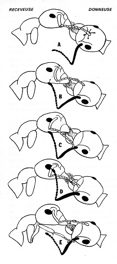 particulièrement pendant les trophallaxies (échanges de nourriture