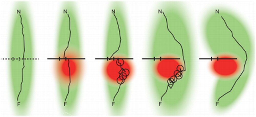 Parcours d'une fourmi type de la mangeoire (F) au nid (N) le piège fermé, à la première chute, à la seconde, au premier contournement, au second ; les cercles signalent les virevoltes d'exploration ; en vert, la mémoire appétitive et en rouge, la mémoire aversive.