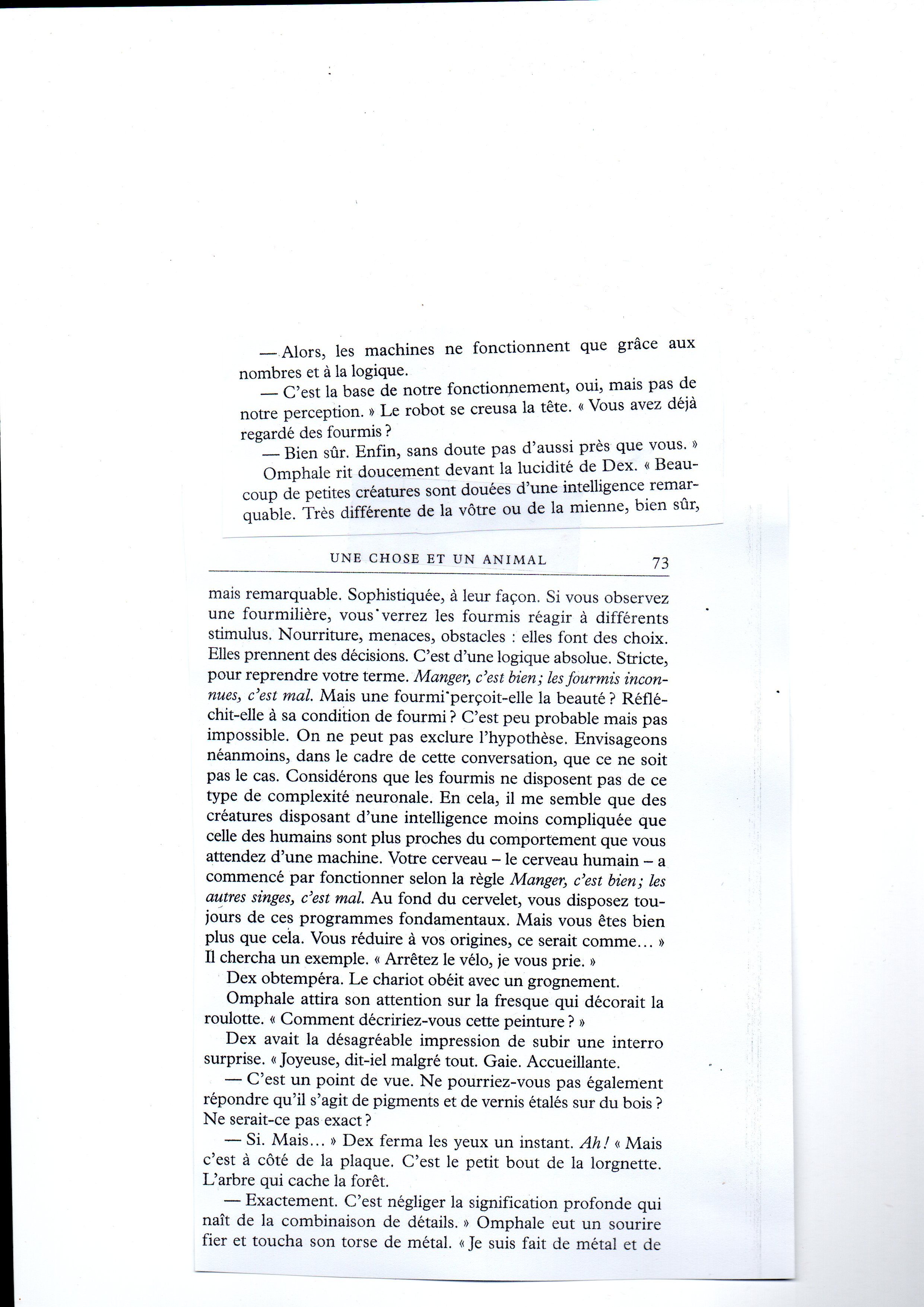 - "Un psaume pour les recyclés sauvages". Livre de Becky Chambers, L'Atalante 2022. Dex, un humain, et Omphale, un robot parlent sur les fourmis. "une fourmi perçoit-elle la beauté ? Réfléchit-elle à sa condition de fourmi ? C'est peu probable mais pas impossible." Voir le texte complet.