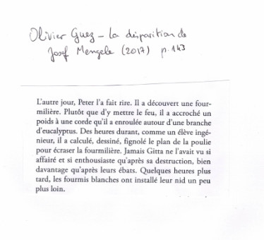 - Olivier Guez dans "La disparition de Jozef Mengele" (Odile jacob 2017), le bourreau nazi d'Auchwitz réfugié en Argentine, écrit que Peter (nom d'emprunt) a inventé un dispositif pour écraser une fourmilière : "L'autre jour, Peter l'a fait rire. Il a découvert une fourmilière. Plutôt que d'y mettre le feu, il a accroché un poids à une corde qu'il a enroulée autour d'une branche d'eucalyptus. Des heures durant, comme un élève ingénieur, il a calculé, dessiné, fignolé le plan de la poulie pour écraser la fourmilière. Jamais Gitta ne l'avait vu si affairé et si enthousiaste qu'après sa destruction, bien davantage qu'après leurs ébats. Quelques heures plus tard, les fourmis blanches ont installé leur nid un peu plus loin." C'était peut-être des termites ? (voir texte)