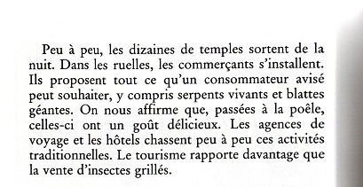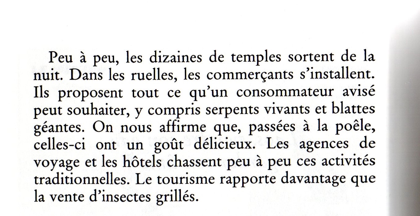- Dans "La terre a soif" d'Erik Orsenna (fayard 2022, p.136) sur les insectes comestibles. Livre super intéresssant qui parle des fleuves du monde et de tous les prolèmes de l'eau. Cet extrait est situé à Louang Prabang (Laos).