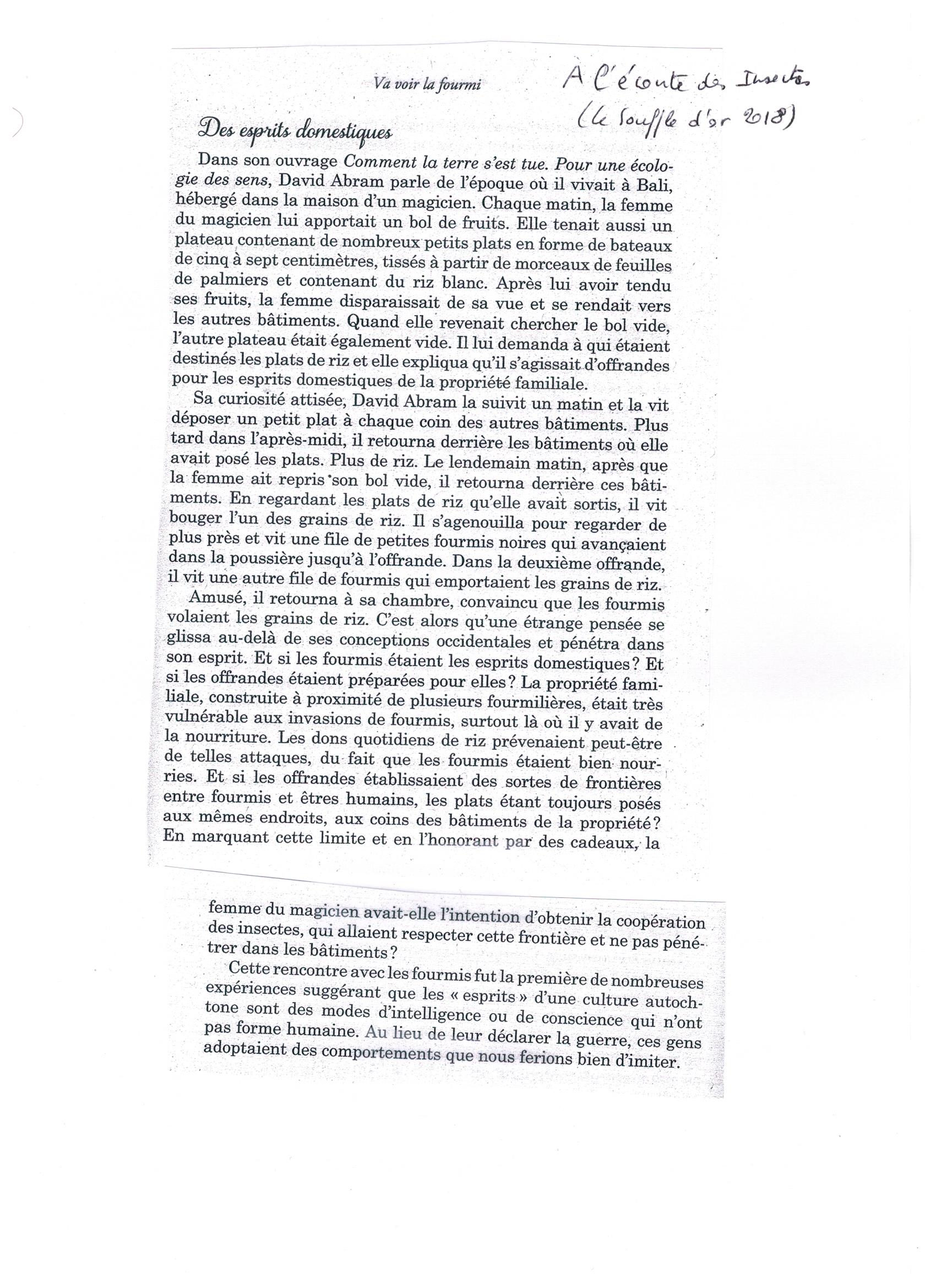 - À l'écoute des Insectes, de Joanne Elizabeth Lauck (Le Souffle d'or 2018) avec tout un chapitre sur les fourmis. Dans "Comment la terre s'est tue" (2014) de David Abraham, il y a une page sur des fourmis qui mangent du riz à Bali