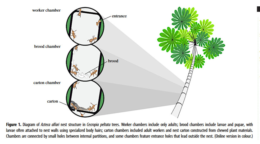Les fourmis Azteca ont leur nid avec des fonctions déterminées : pouponnière, réserve de nourriture, salle de repos, décharge. Chaque chambre de la domatie a un microbiome particulier et différent de celui du milieu environnant. Les Azteca maintiennent une propreté excellente, surtout autour du couvain. En revanche, elles ne s’occupent pas des agents de maladies pouvant affecter le parasolier ; de ce point de vue, elles ne le protègent pas. Les microbiomes varient selon l’endroit mais partout, la propreté est bien supérieure à ce qu’on trouve dans nos maisons et appartements.. Voir Lucas et al 2019 et Une leçon de propreté.