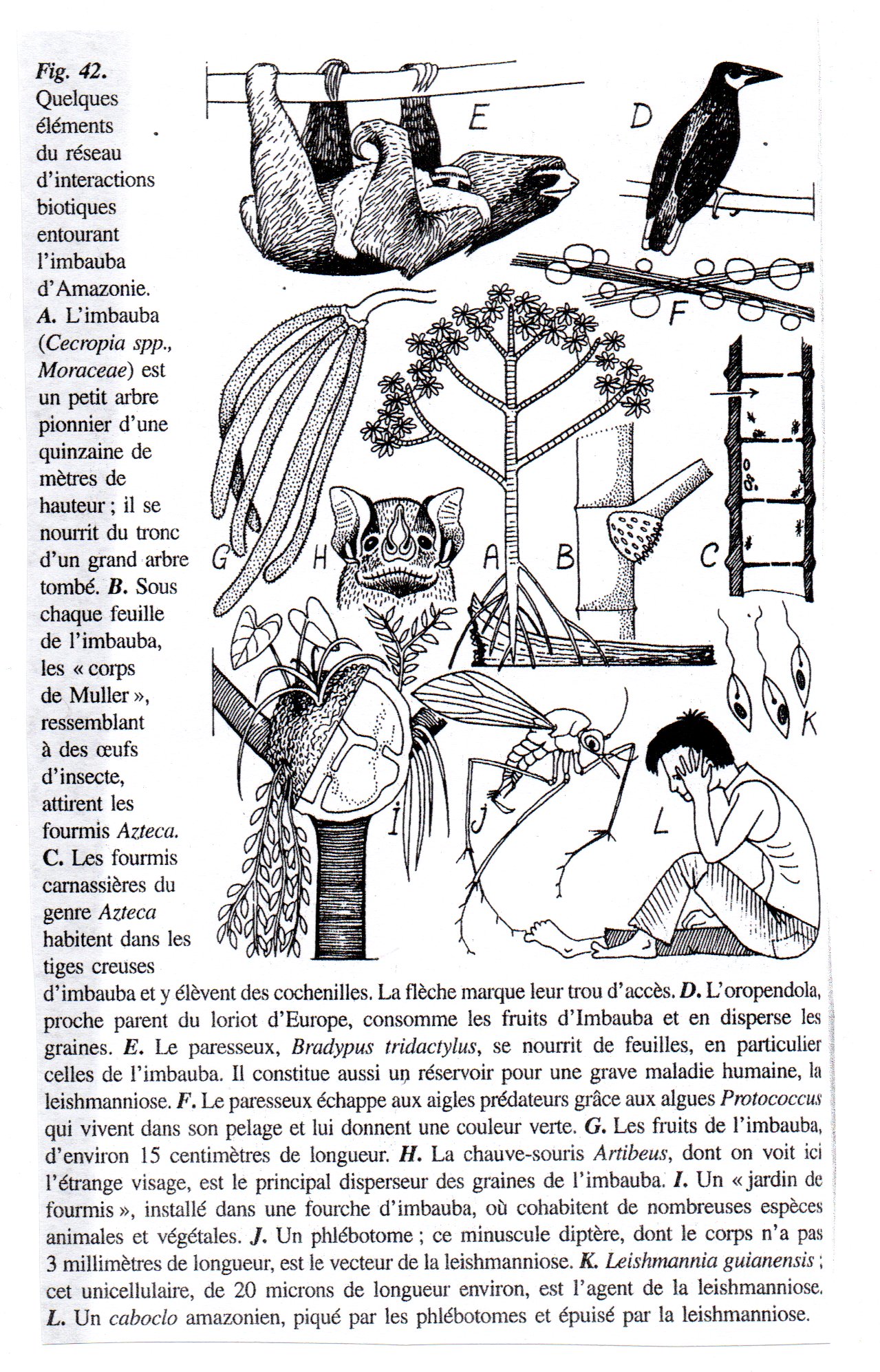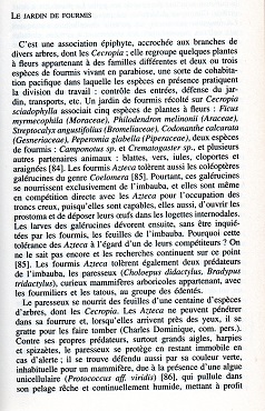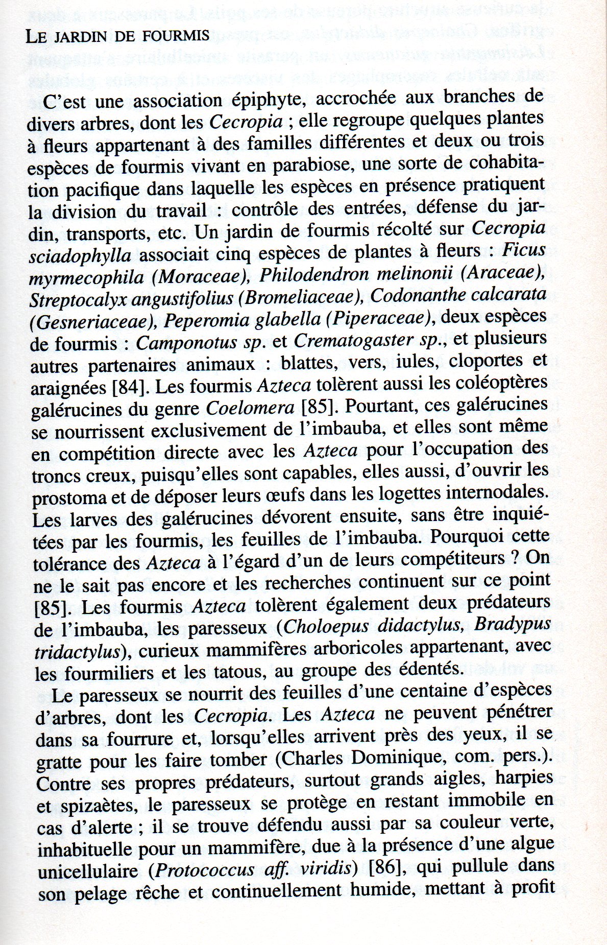 Deux pages du livre de Francis Hallé "Un monde sans hiver" (1993) sur les fourmis : les jardins de fourmis et les interactions entourant l'imbauba (Cecropia) arbre d'Amazonie où l'on trouve les Azteca.