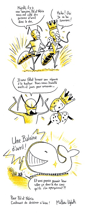 Une belle baleine d'avril, dessin de Mathieu Ughetti (dessinateur de "La guerre des fourmis" en réponse aux poissons d'avril de Pol et Nuria Cerda. Voir Poissons d'avril