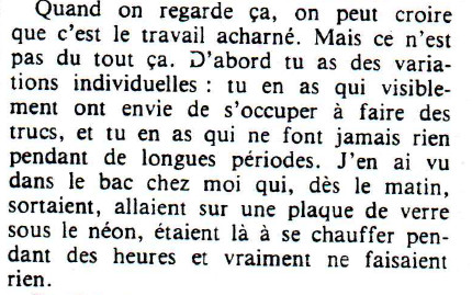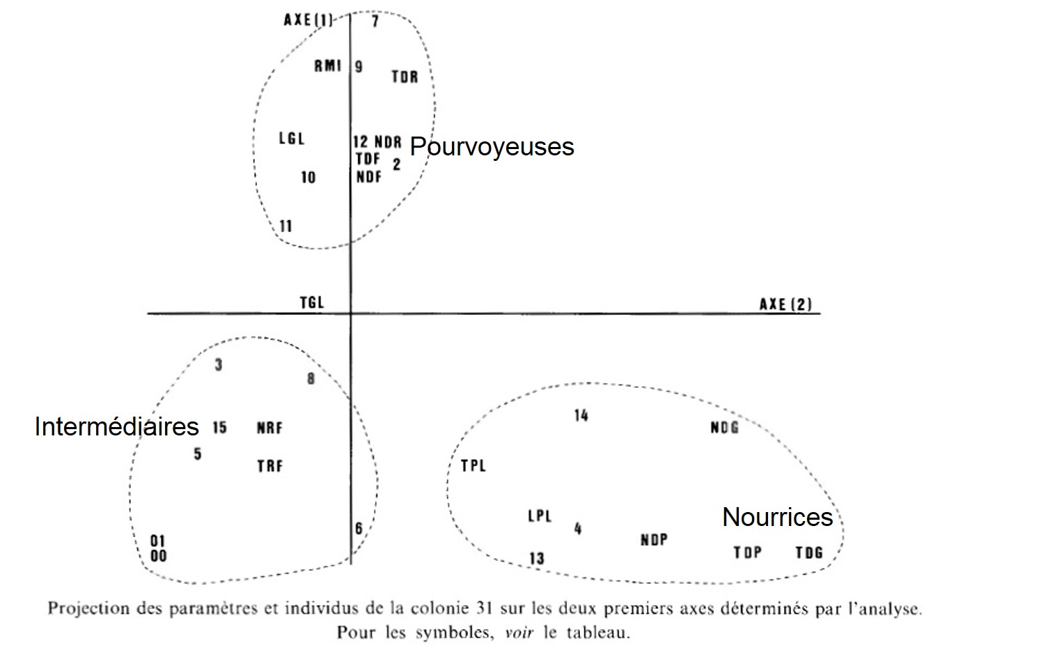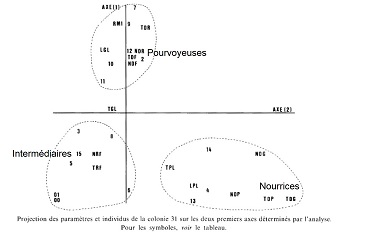 Idiosynchrasie. J’ai commencé à traiter ces données en analyse factorielle, ce qui n’était pas du tout connu à l’époque. En collaboration avec un informaticien, Jean-Claude Mardon (photos 1 et 2), nous avons fait des analyses de correspondance montrant la variabilité interindividuelle dans les comportements à l’intérieur d’une colonie de fourmis. On trouve trois groupes dans la colonie (nourrices, pourvoyeuses et peu actives) (Lenoir et Mardon 1978, Lenoir 1979 cité dans Passera 2008 p.36).