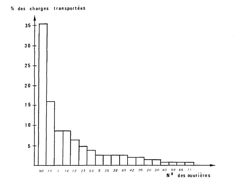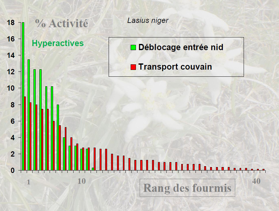 Des ouvrières hyperactives qui font presque tout le travail ! En effet, pour une tâche donnée seuls un petit nombre d'ouvrières sont très actives comme on le voit sur ce graphique pour le comportement nécrophorique (Ataya et Lenoir 1984). La fourmi n° 50 fait 35% des transports (on l'appelera hyperactive), la 19 fait 15% et les autres beaucoup moins. Dans une autre expérience où l'on bloque l'entrée du nid et où l'on dépose du couvain dans l'aire extérieure pour le rapporter dans le nid, on observe un moins grande spécialisation, mais toujours une forte différenciation entre fourmis. L'existence de fourmis "lazy" vient de revenir à la mode, voir Fourmi travailleuse.