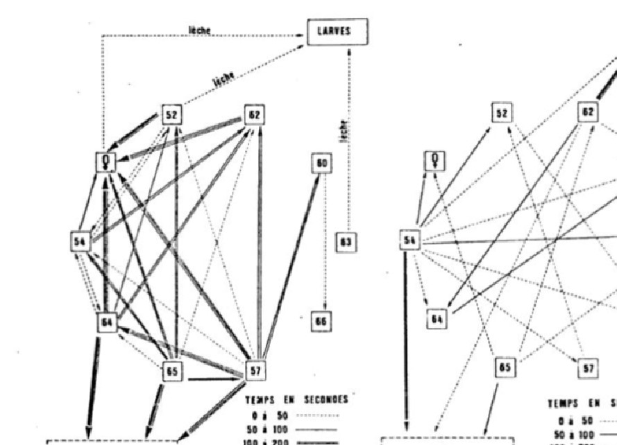 montrant les contacts entre individus, envers la reine et les larves, la récolte