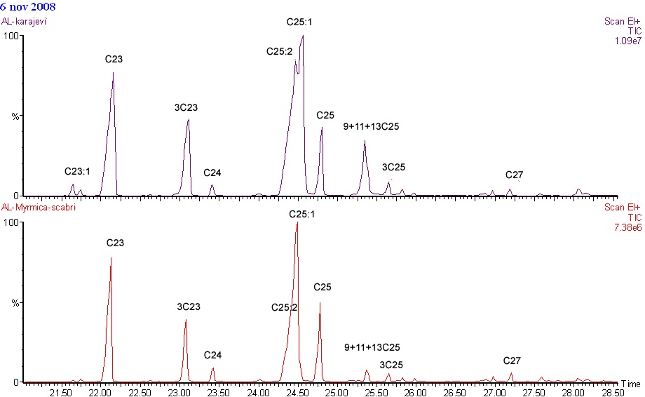 J'en ai trouvé en montagne le 9 août 2008 (Samoëns - 74) dans des nids de M. scabrinodis. Ce sont des fourmis très rares et elles semblent avoir disparues à cet endroit. Les parasites M. karavajevi ont le même profil d'hydrocarbures cuticulaires que leur hôte à 95% comme la variation entre fourmis à l'intérieur d'une colonie (données non publiées).