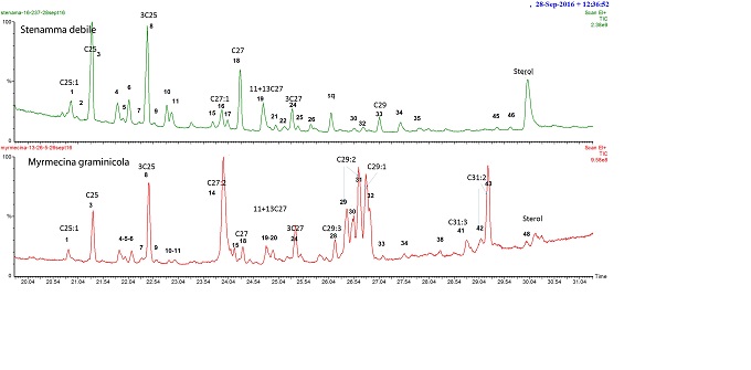 Profil d'hydrocarbures de S. debile comparé à celui de Myrmecina graminicola qui vit dans le même type d'habitat et qui n'a pas d'alcènes (Lenoir et al 2018).
