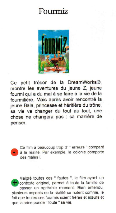 Pari réussi. Fourmiz, hilarant, raconte les aventures de Z, fourmi anar et névrosée qui s'interroge sur l'Insectopia qui existerait au-delà de la fourmilière. Il se plaint à son psy du manque d'affection inévitable "quand on n'est que l'enfant du milieu dans une famille de 5 millions" et s'entiche de la princesse Bala. Comme le note le New Yorker, "Fourmiz ressemble plus qu'un peu à un film de Woody Allen" et pas seulement parce que ce dernier donne sa voix à Z. Pari risqué mais réussi: depuis sa sortie sur les écrans américains, il y a un mois, Fourmiz caracole au sommet du box-office. Il a attiré plus de spectateurs, et rapporté plus d'argent (75 millions de dollars, soit 412 millions de francs) que tout autre film d'animation non "made in Disney".