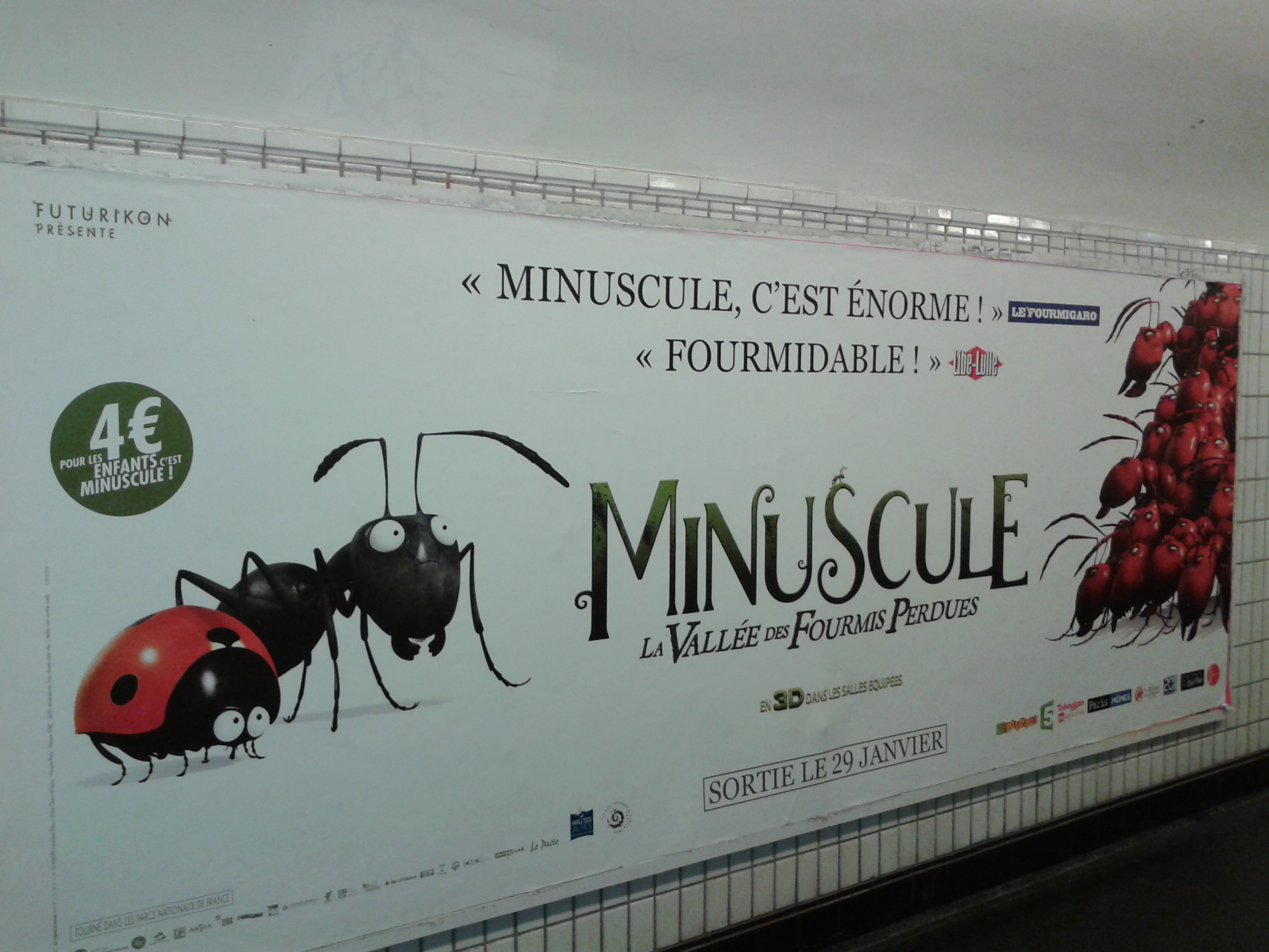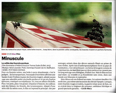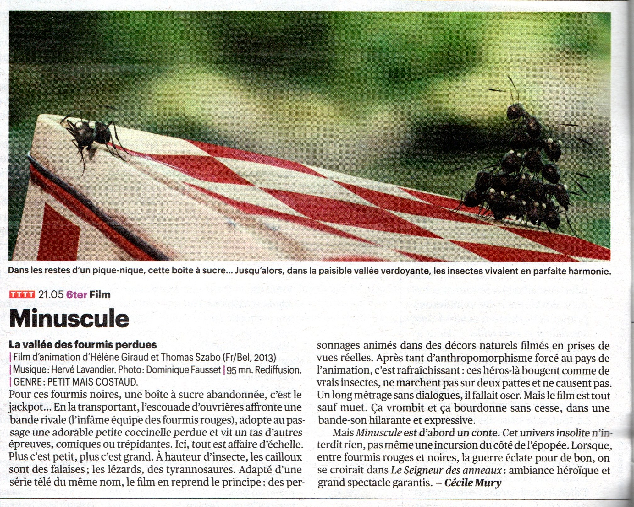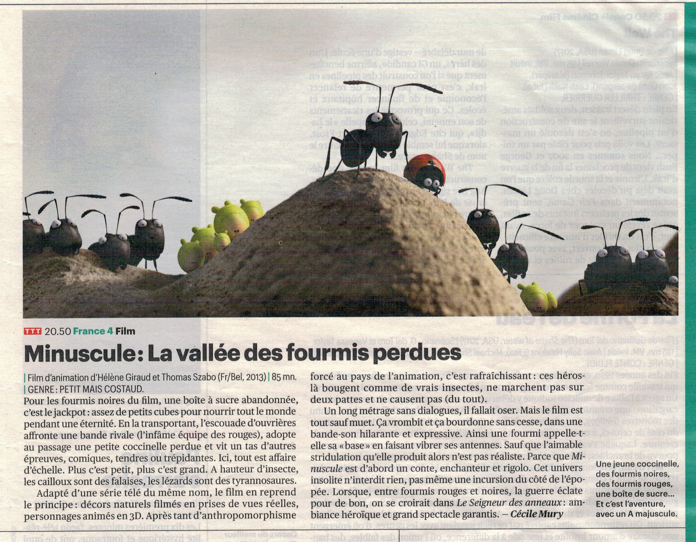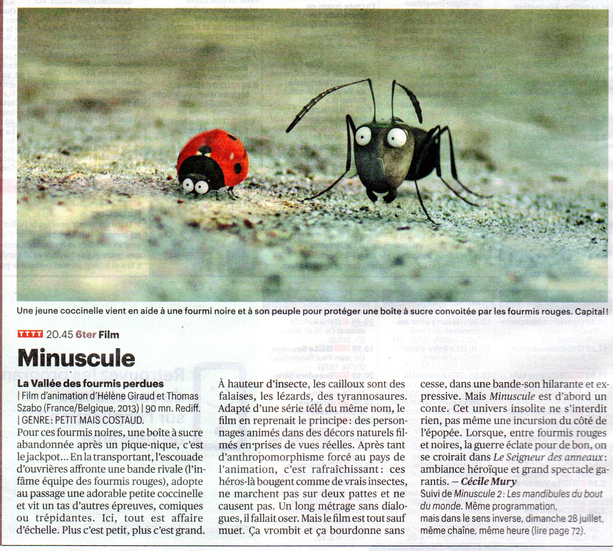 "Minuscule : La Vie privée des insectes, la série télévisée au format court passa au format du long-métrage avec une aventure d’1h30. Un film intitulé Minuscule : La vallée des fourmis perdues et qui rencontra un large succès en France, du côté des critiques en obtenant en 2015 le César du Meilleur film d’animation, mais aussi du côté du public avec plus d’1,5 millions de spectateurs français. Un film d’animation pour toute la famille qui avait émerveillé petits et grands." Film repassé sur France 4 le 19 février 2019, et sur Gulli le 22 juin 2021, toujours autant de plaisir à voir ce film. Voir la critique de Télérama qui est reprise mot à mots dans Télérama du 16 juin 2021 et du 1er février 2023..