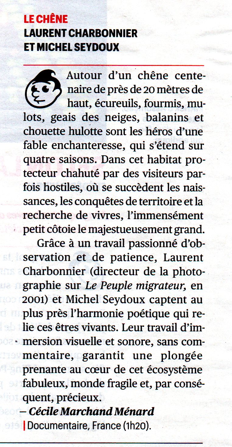Film documentaire de Laurent Charbonnier et Michel Seydoux (2022). Tout ce qui se passe autour d'un très vieux chêne sur une année. Un peu long..