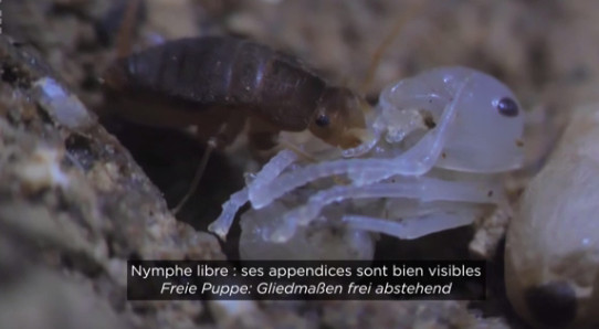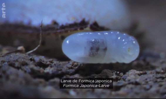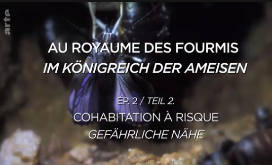 - épisode 2 - Cohabitation à risque. "Les fourmis travailleuses Camponotus japonicus s’occupent de leurs larves, qu’elles nettoient et ravitaillent, ainsi que de celles des papillons Niphanda fusca, en échange du précieux miellat qu’elles leur fournissent. La mouche phoride pond ses œufs dans l’arrière-train des Camponotus japonicus, où les larves pourront prospérer en se nourrissant des organes internes de leurs hôtes. En couvrant leurs corps avec les phéromones des Solenopsis invicta, les Myrmecophilus (ou grillons fourmis) vont partager la même signature que les fourmis et pourront ainsi se nourrir de leurs larves."