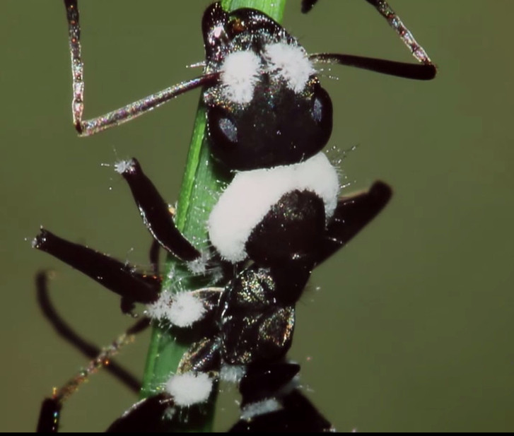 un champignon entomopathogène Beauveria. Les fourmis montent