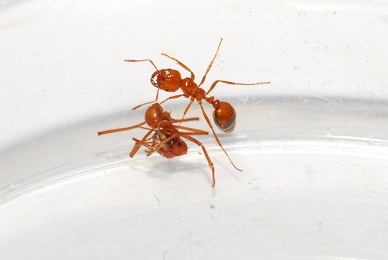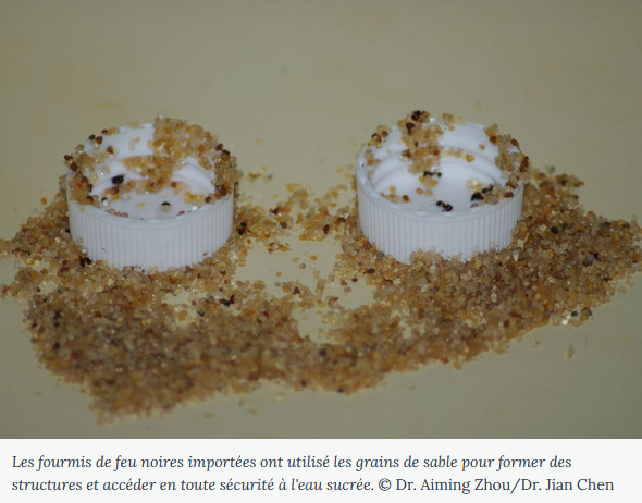 Solenopsis richteri (fourmi de feu noire) est capable d'utiliser des grains de sable pour exploiter une source d'eau sucrée sans se noyer (voir plus)