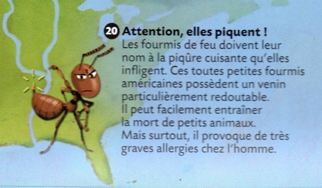 Espèces invasives en Europe : Poisson-chat, fourmi de feu, hakéa : ces animaux et plantes font désormais partie de la liste des espèces invasives en Europe (Geo 21 juillet 2022). "La liste des "espèces exotiques envahissantes préoccupantes pour l’Union européenne" a été mise à jour pour la troisième fois depuis 2016, intégrant 22 nouvelles espèces et portant le nombre total à 88 espèces, dont 47 d'animaux et 41 de plantes." "Les fourmis de feu (Solenopsis geminata, Solenopsis invicta, Solenopsis richteri & Wasmannia auropunctata) - quatre espèces de fourmis tropicales" "La plus petite espèce de fourmi de feu, Wasmannia auropunctata, est surnommée "fourmi électrique" en raison de la sensation de choc électrique ressentie lors de sa morsure toxique, qui peut rendre les chiens et les chats aveugles. Au niveau européen, des nids de cette espèce invasive - originaire d'Amérique centrale et du sud - ont été repérés sous des serres en Angleterre."