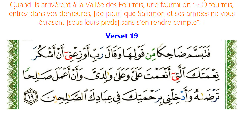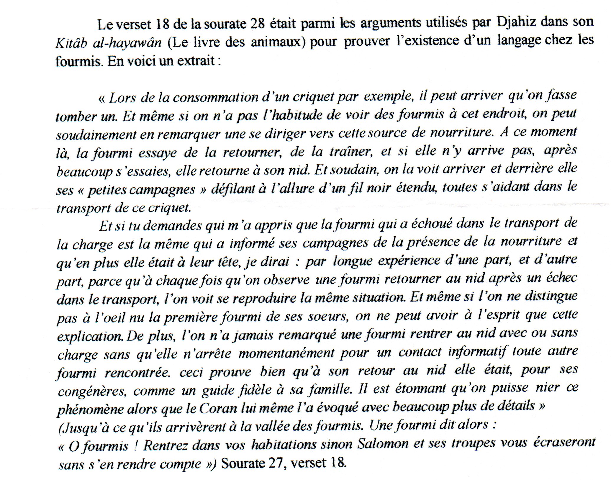 Les fourmis sont également présentes dans le Coran. La sourate 27, Al Naml, porte leur nom. Les fourmis sont mentionnées dans le verset 18. Elles y apparaissent comme un peuple évolué apeuré par la venue de Salomon. Ce texte datant de l'époque du Prophète servit par la suite de support à Djahiz dans son Kitâb al-hayawân (Le livre des animaux, 8/9ème siècle). Dans ce livre Djahiz décrit la fourmi comme un animal doté d'un odorat extrêmement fin lui permettant de détecter la nourriture à de grandes distances et d'informer les autres fourmis de la présence de cette nourriture pour faire un recrutement (voir texte plus loin). Le comportement des fourmis moissonneuses est aussi décrit. Les mêmes données se retrouvent dans " Les merveilles de la création" (Quazwini, 13ème siècle) et " La grande vie des animaux " (Damiri, 14ème siècle) (A. Aarab, comm. pers., 5 août 1996, voir aussi Aarab et al 2003)).