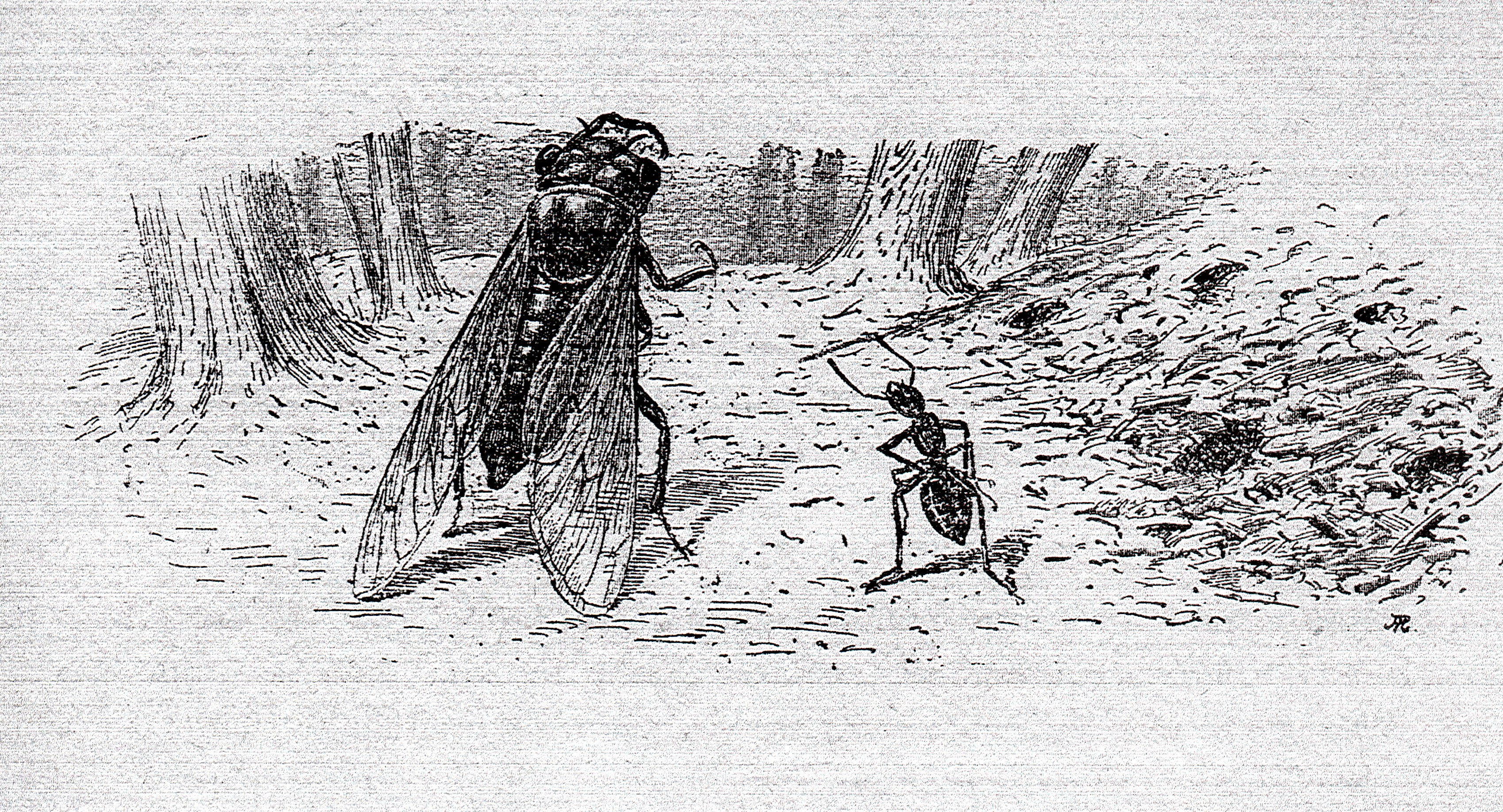 La cigale et la fourmi (voir une partie du texte) où Fabre replace la fable dans l'histoire avec Esope et veut réhabiliter la cigale.