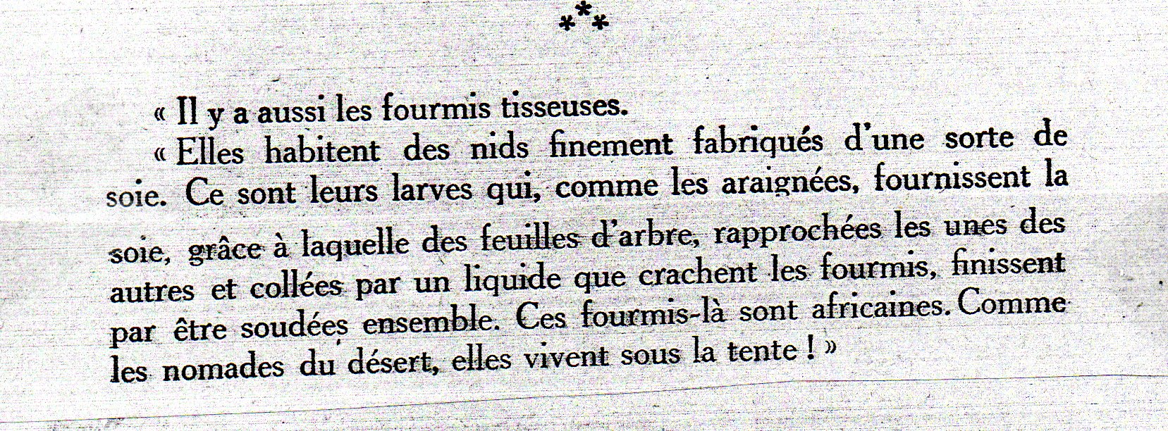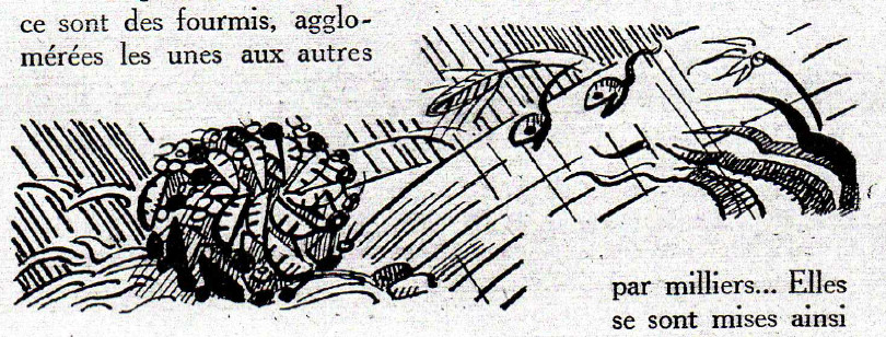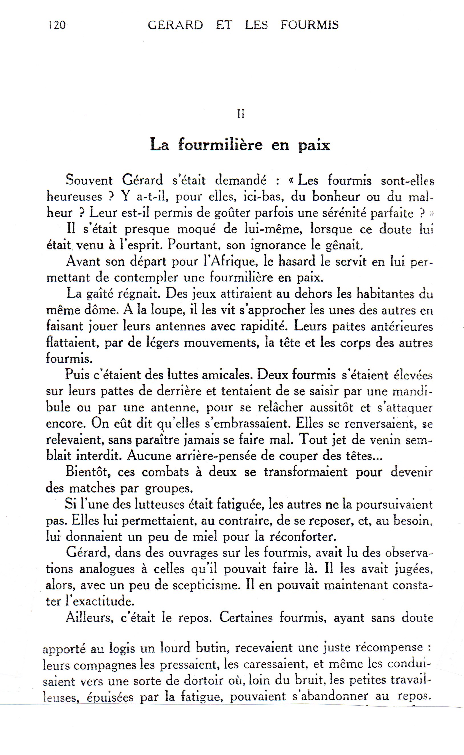 La vie des fourmis découverte par Gérard. Gérard est un jeune garçon que l'étude des fourmis passionne ; à Fontainebleau, en Suisse, en Tunisie il retrouve ses amies les fourmis qu'il aime presque autant que sa gentille petite camarade Nicole. Et il a bien observé les fourmis. C'est très anthropomorphique mais plein de bonnes remarques, comme par exemple sur le jeu chez les fourmis ("On eu dit qu'elles s'embrassaient. Elles se renversaient, se relevaient, sans paraître jamais se faire mal." (p.120). Il y a presque tout sur la vie des fourmis, y compris les coléoptères myrmécophiles "des coléoptères qui se conduisent en bons serviteurs. Ils s'occupent de la vidange, dévorent les moisissures, font disparaître tout ce qui pourrait causer quelque infection, mangent les cadavres de fourmis décédées, ceux des nymphes qui n'ont pas pu voir le jour, et surtout avalent ces méchantes mites qui ennuient tellement les fourmis." (p.97).