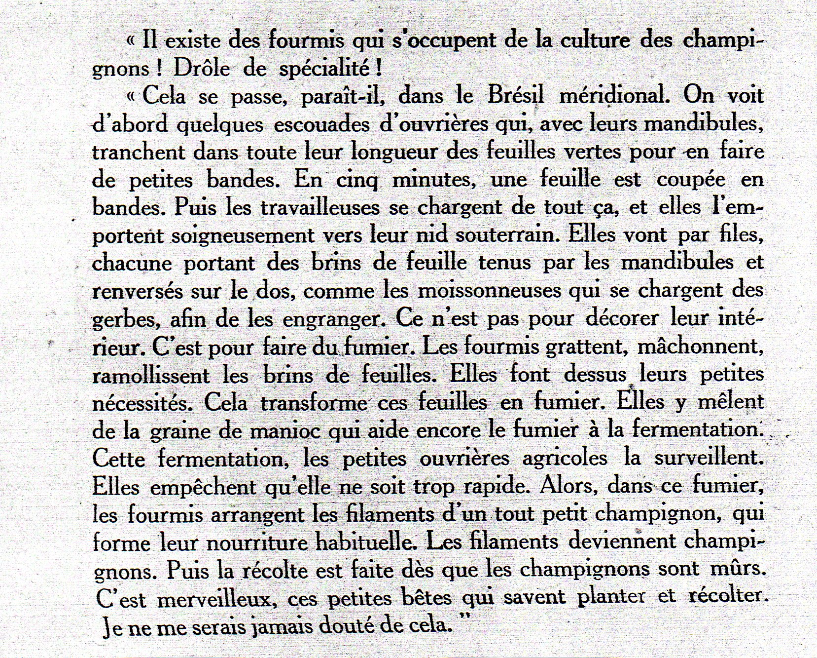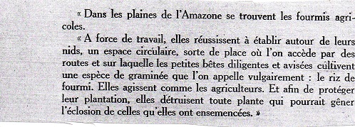 Les fourmis agricoles : selon Jacques Delabie "Je pense qu'il y a une certaine confusion de l'auteur pour ce qu'il appelle "les fourmis agricoles". A mon avis, il s'agit d'Acromyrmex. Il y aurait plusieurs candidates possibles, avec les "routes", je suppose des pistes permanentes qui irradient du nid, et le fait qu'elles sélectionnent la végétation près du nid dans un espace circulaire me fait penser à Acromyrmex rugosus, ou Acromyrmex disciger. Les Atta aussi en fait, mais comme l'auteur en parle ailleurs.... Le "riz des fourmis" me fait aussi penser plutôt à Acromyrmex balzani (ou Acromyrmex landolti) : il y a beaucoup de confusion sur ces deux espèces par ici, car cette fourmi très fréquente récolte exclusivement des graminées, dont les déchets sont abandonnés en arc-de cercle assez près de l'entrée de la fourmilière. Ces déchets sont tout à fait caractéristiques par leur couleur (jaune) et leur aspect de débris de graminées qui pourraient être confondus avec l'enrobage des grains de riz. Il manque par contre à la description faite par l'auteur, la petite cheminée construite avec des débris de plantes et qui protège l'entrée des nids d'A. balzani." (mail du 15 janvier 2021).