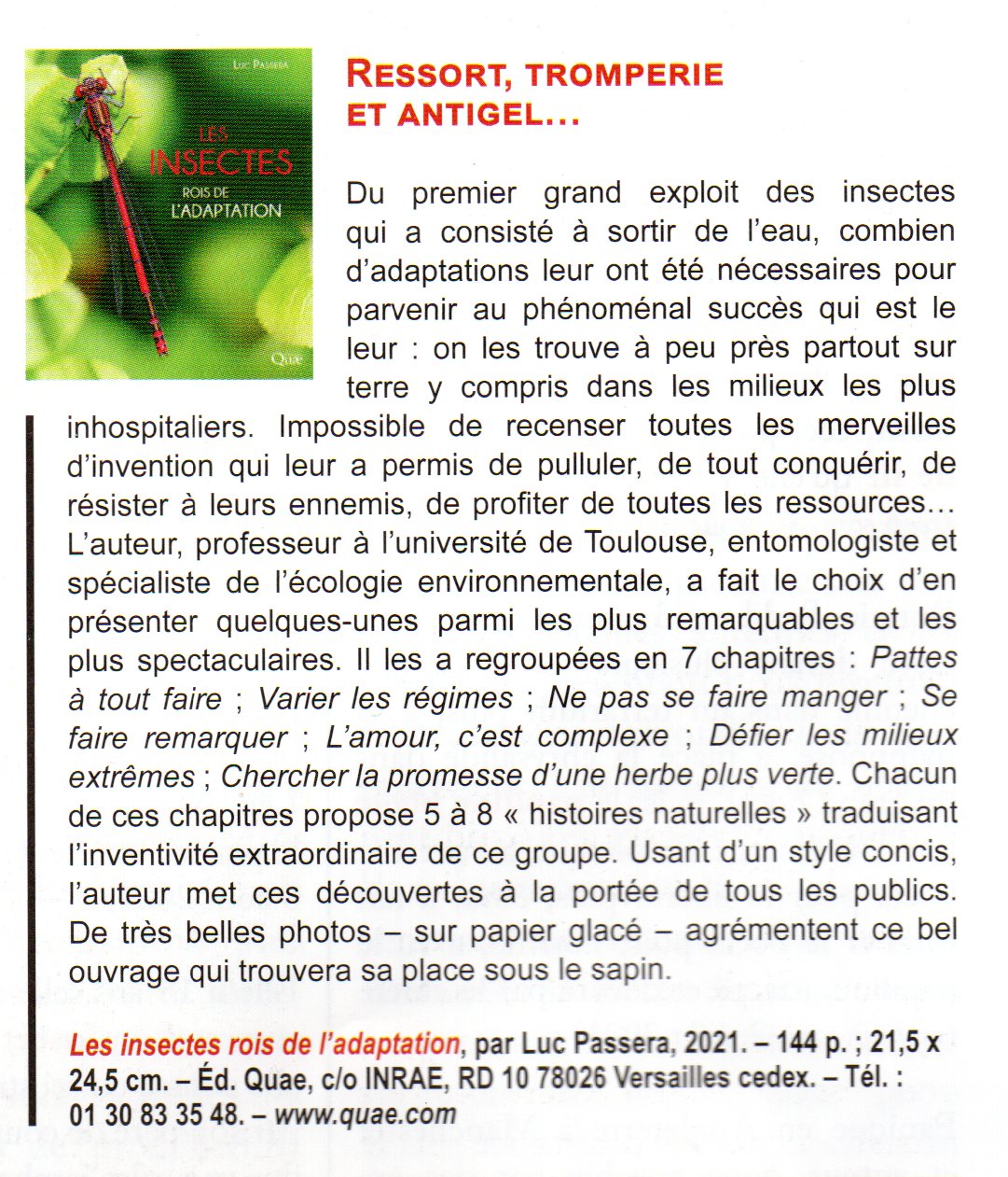 Analyse du livre de Luc Passera "Les insectes, rois de l'adaptation". Ressort, tromperie et antigel, dans Insectes n°203, décembre 2021... Texte