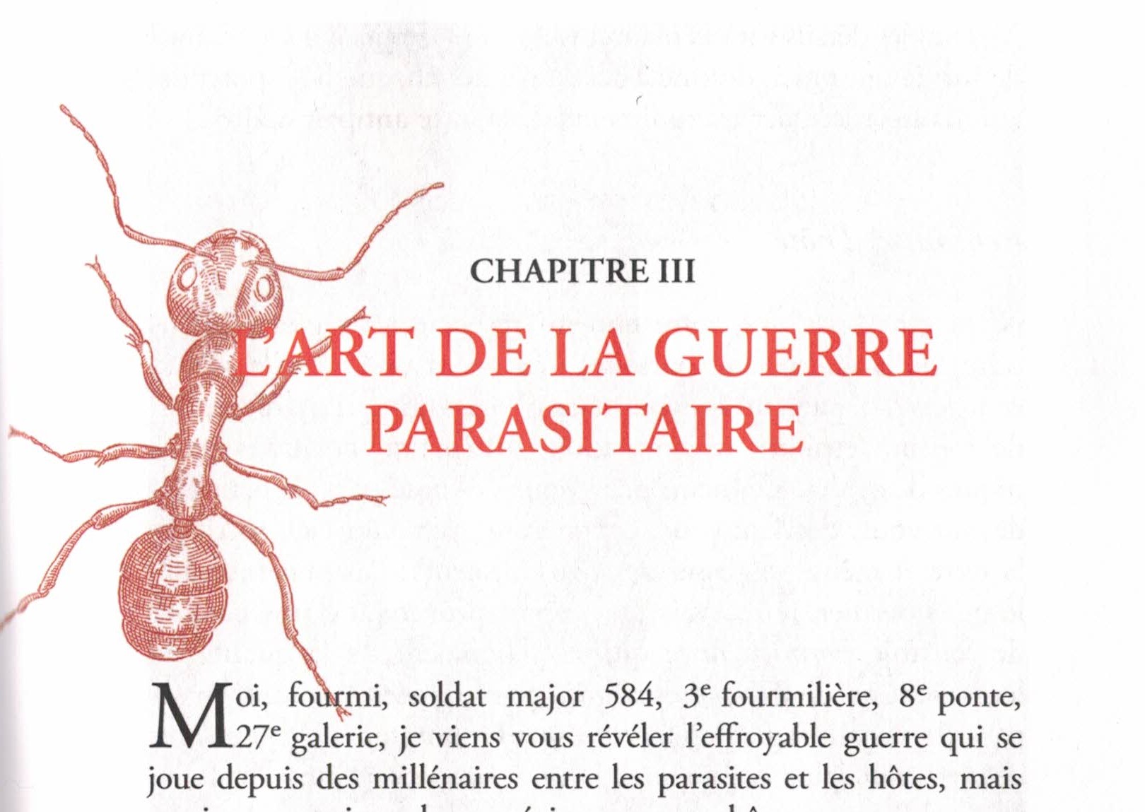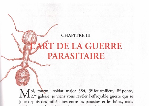 Livre très bien écrit, bien documenté, facile à lire et super-intéressant. Tout un chapitre remarquable sur "l'Art de la guerre parasitaire" des fourmis (chap. 3). L'auteur s'inspire de Bernard Werber en faisant parler "Moi, fourmi, soldat major 584, 3e fourmilières, 8e ponte, 27e galerie". il conclue le chapitre par "AuX Arrmmmes Fourmis, FOurmmmmezzz vos bat..."