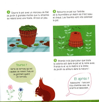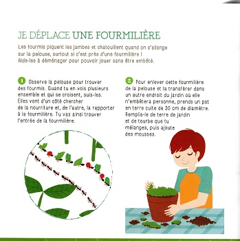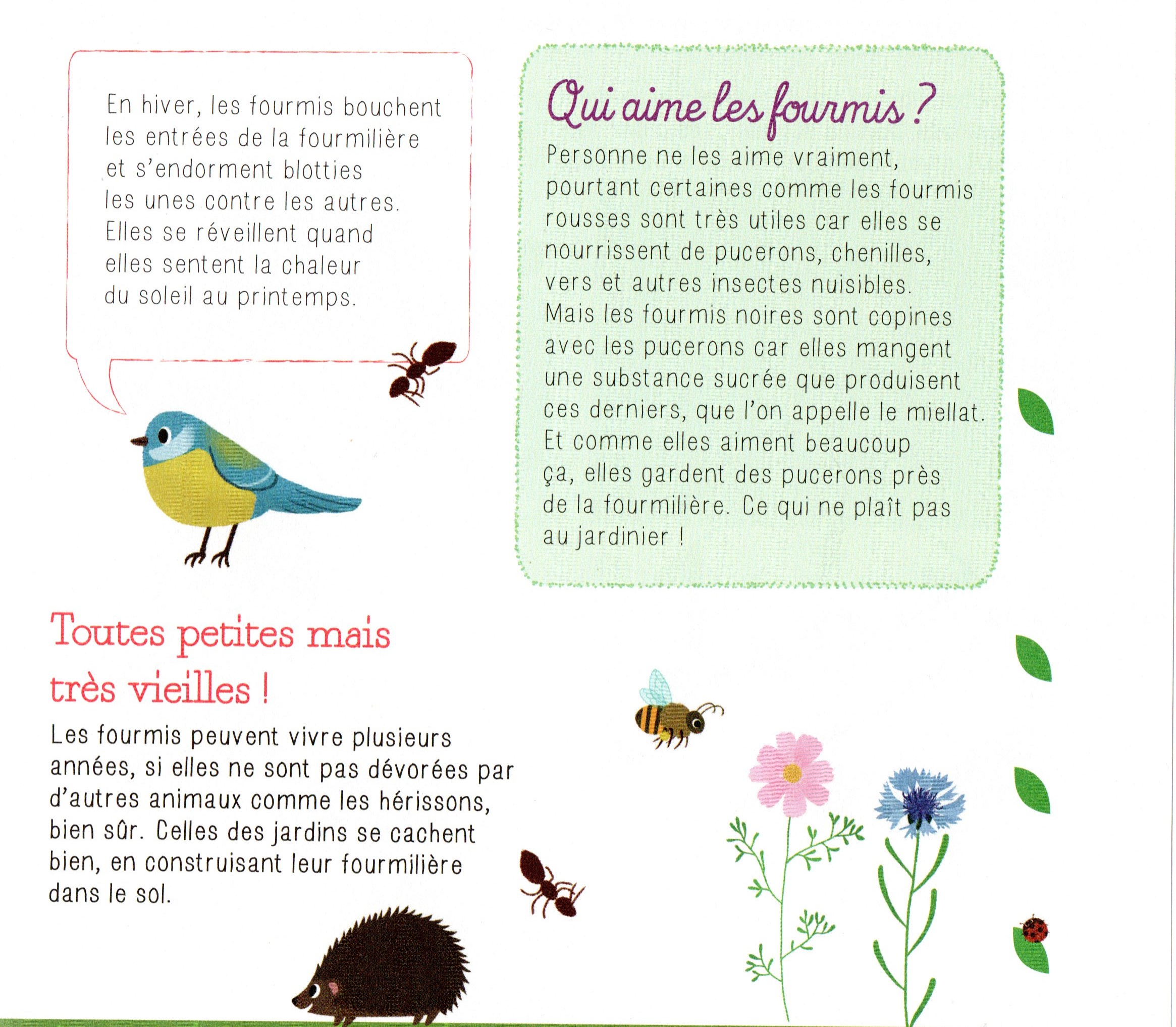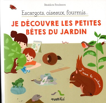 Je découvre les petites bêtes du jardin, de Bénédicte Boudassou, Rustikid, 2013 (réédition 2020). Très beau livre sur les escargots, oiseaux, fourmis mais aussi plein d'autres espèces. Voir Comment déplacer une fourmilière.