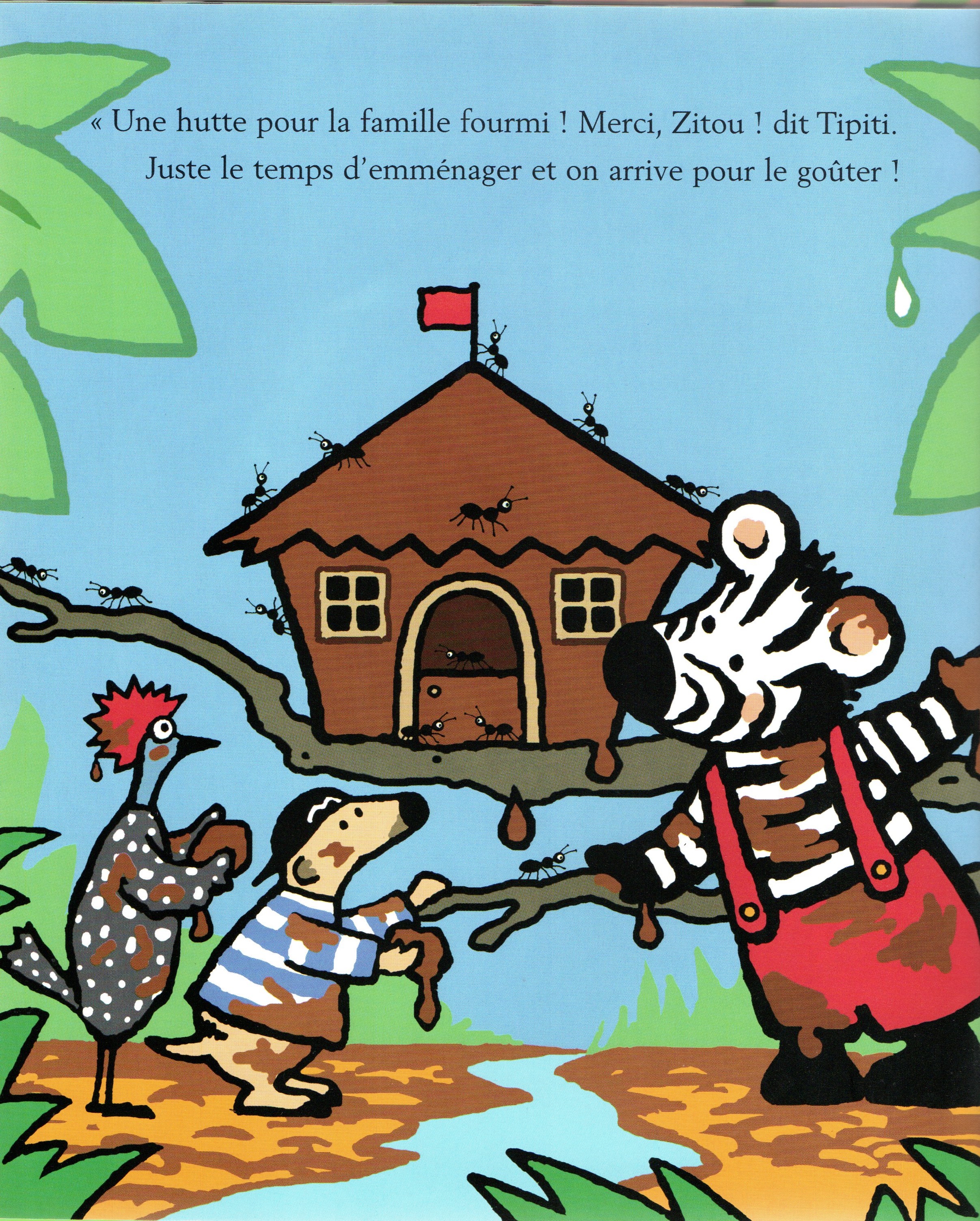 Zitou est un zèbre des marécages. Il se réveille un matin avec la fourmi Tipiti sur son oreiller. La fourmilière de Tipiti a été détruite par un orage et elle cherche une nouvelle maison. Les fourmis de la colonie de Tipiti arrivent en file à la maison de Zitou et s'y installent, elles mangent tout. Mousse, la mangouste va aider Zitou à se débarrasser des fourmis en les perdant dans la forêt. Plus tard il les recherche .. et les retrouve dans son terrier.. qu'ils aménagent en maison pour les fourmis. Bien sûr il faut rester amis..