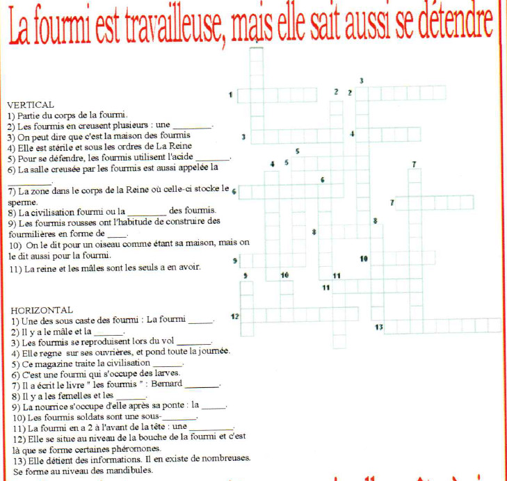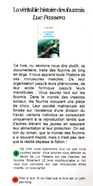 Avec interview d'Alain Lenoir, des textes sur la vie des fourmis, la construction d'un nid, une expo sur les fourmis à Tours (Pdf), les films FourmiZ et Les 1001 pattes et d'autres choses comme un mot-croisé. Pdf complet (24 pages).