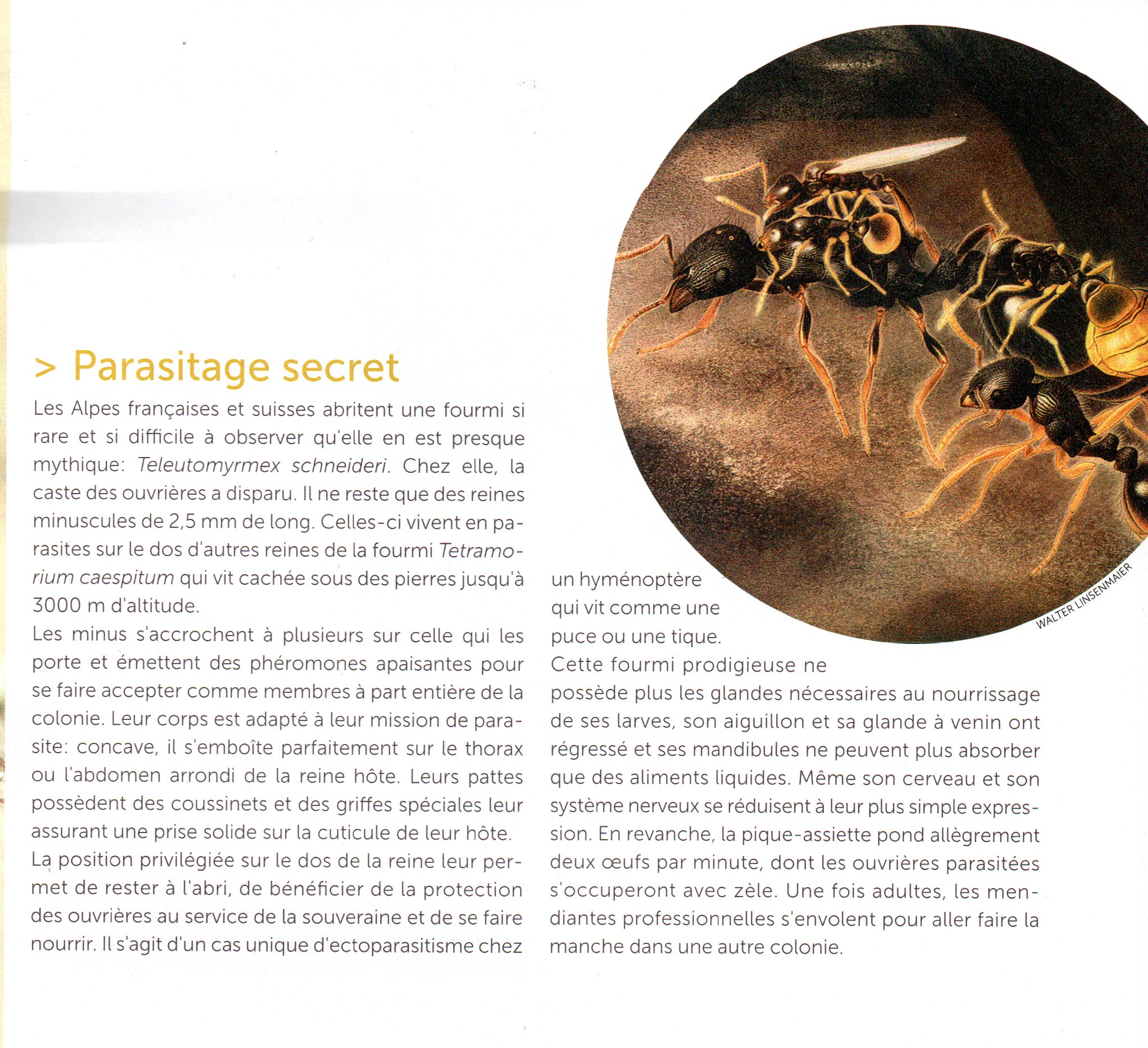 Avec : Bienvenue à Fourmicity, Mégapole des minuscules, Printemps fourmiliant, Je t'aime à mourir, Sacré curriculum, Corps de rêve, Le bon, la brute et le truand, copinages et trahisons, Ensemble, c'est tout, Fourminoïdes (interview de Guy Théraulaz, CNRS Université de Toulouse). Quelques petits passages : un parfum de détresse (travaux d'Elise Nowbahari), meurtres et esclavage (Myrmoxenus parasite de Temnothorax), parasitage secret (Teleutomyrmex parasite de Tetramorium). A acheter sur le site de Salamandre