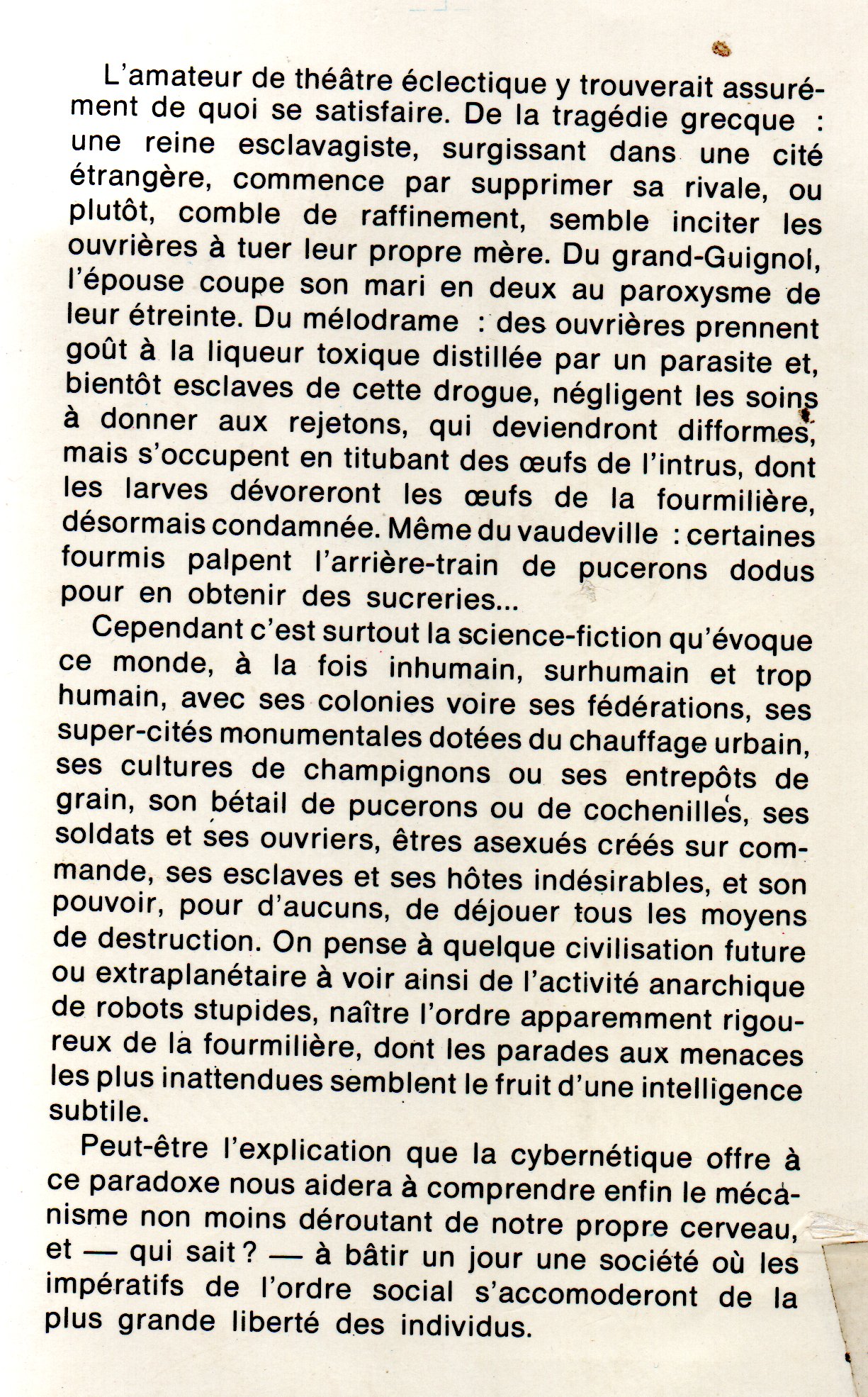 La présentation du livre :"L'amateur de théâtre éclectique y trouverait assurément de quoi se satisfaire. De la tragédie grecque : une reine esclavagiste, surgissant dans une cité étrangère, commence par supprimer sa rivale, ou plutôt, comble de raffinement, semble inciter les ouvrières à tuer leur propre mère. Du grand-Guignol, l'épouse coupe son mari en deux au paroxysme de leur étreinte. Du mélodrame : des ouvrières prennent goût à la liqueur toxique distillée par un parasite et, bientôt esclaves de cette drogue, négligent les soins à donner aux rejetons, qui deviendront difformes, mais s'occupent en titubant des oeufs de l'intrus, dont les larves dévoreront les œufs de la fourmilière, désormais condamnée. Même du vaudeville : certaines fourmis palpent l'arrière-train de pucerons dodus pour en obtenir des sucreries... Cependant c'est surtout la science-fiction qu'évoque ce monde, à la fois inhumain, surhumain et trop humain, avec ses colonies voire ses fédérations, ses super-cités monumentales dotées du chauffage urbain, ses cultures de champignons ou ses entrepôts de grain, son bétail de pucerons ou de cochenilles, ses soldats et ses ouvriers, êtres asexués créés sur commande, ses esclaves et ses hôtes indésirables, et son pouvoir, pour d'aucuns, de déjouer tous les moyens de destruction. On pense à quelque civilisation future ou extraplanétaire à voir ainsi de l'activité anarchique de robots stupides, naître l'ordre apparemment rigoureux de la fourmilière, dont les parades aux menaces les plus inattendues semblent le fruit d'une intelligence subtile. Peut-être l'explication que la cybernétique offre à ce paradoxe nous aidera à comprendre enfin le mécanisme non moins déroutant de notre propre cerveau, et — qui sait ? — à bâtir un jour une société où les impératifs de l'ordre social s'accomoderont de la plus grande liberté des individus." (voir le pdf).