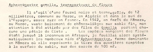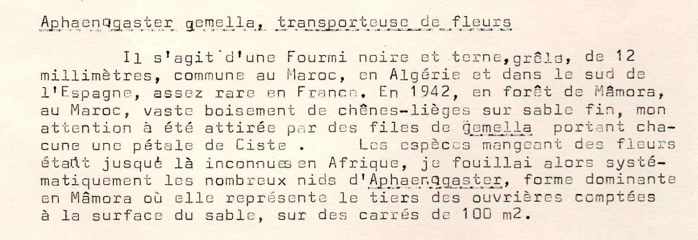 Aphaenogaster gemella, transporteuse de fleurs. On a avec Xim Cerda étudié A. spinosa qui transporte aussi des fleurs.