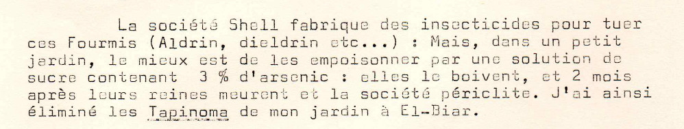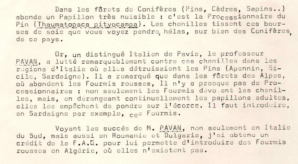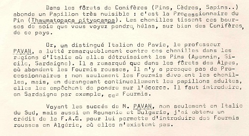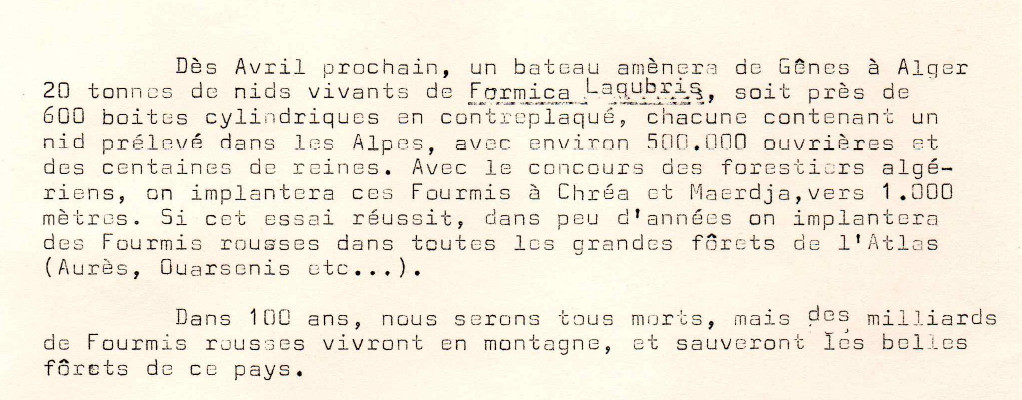 En 1971 F. Bernard avait organisé le transport de Formica lugubris de Gênes vers Alger :