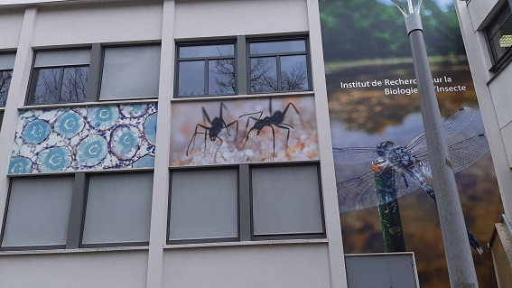 - La façade de l'IRBI à Tours avec des fourmis en 2019, en souvenir de Raphaël