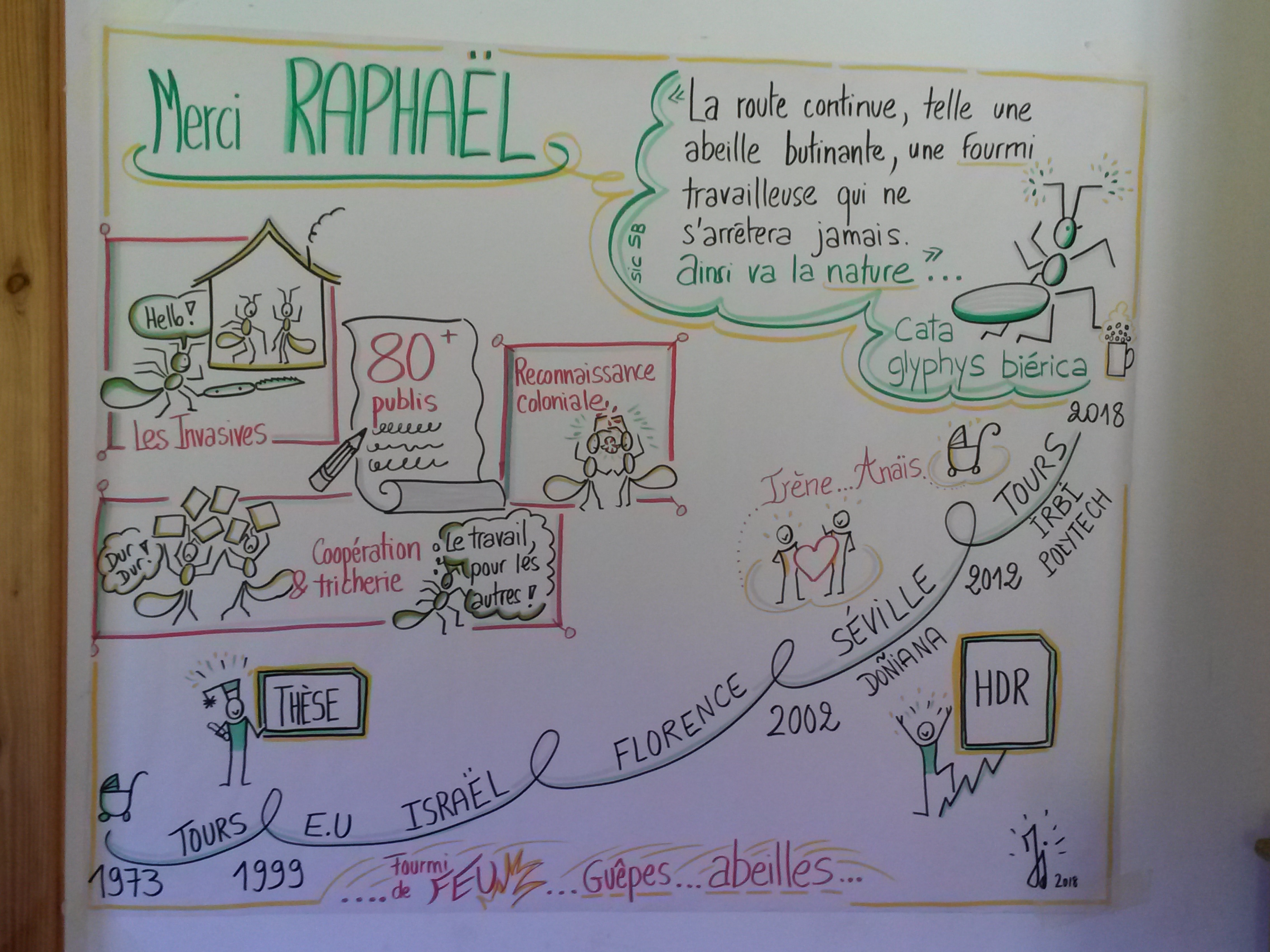 - "Raphaël était un passionné qui a consacré plus de 20 ans de sa vie a l’étude des fourmis et de leur écologie. Apres une thèse à Tours, il a travaillé en Louisiane, en Israël et en Espagne comme post-doc. Il était professeur a l’IRBI (Université Tours) depuis 2012 et travaillait en étroite collaboration avec la station biologique de Donana en Espagne. Tres impliqué dans la section française de l’IUSSI dont il a été vice-président jusqu’en 2017, Raphaël était un expert reconnu et incontournable des fourmis et plus particulierement des genres tels que Cataglyphis, Aphaenogaster ou Azteca. En plus de ses qualités scientifiques, Raphaël était un homme tres apprécié de ses collegues et avec lequel il était toujours tres agréable de discuter. Sa disparition soudaine laisse la communauté des chercheurs insectes sociaux, ses collegues et amis dans une profonde tristesse." Mathieu Lihoreau, pour le bureau de la section française IUSSI (mail 3 juillet 2018)