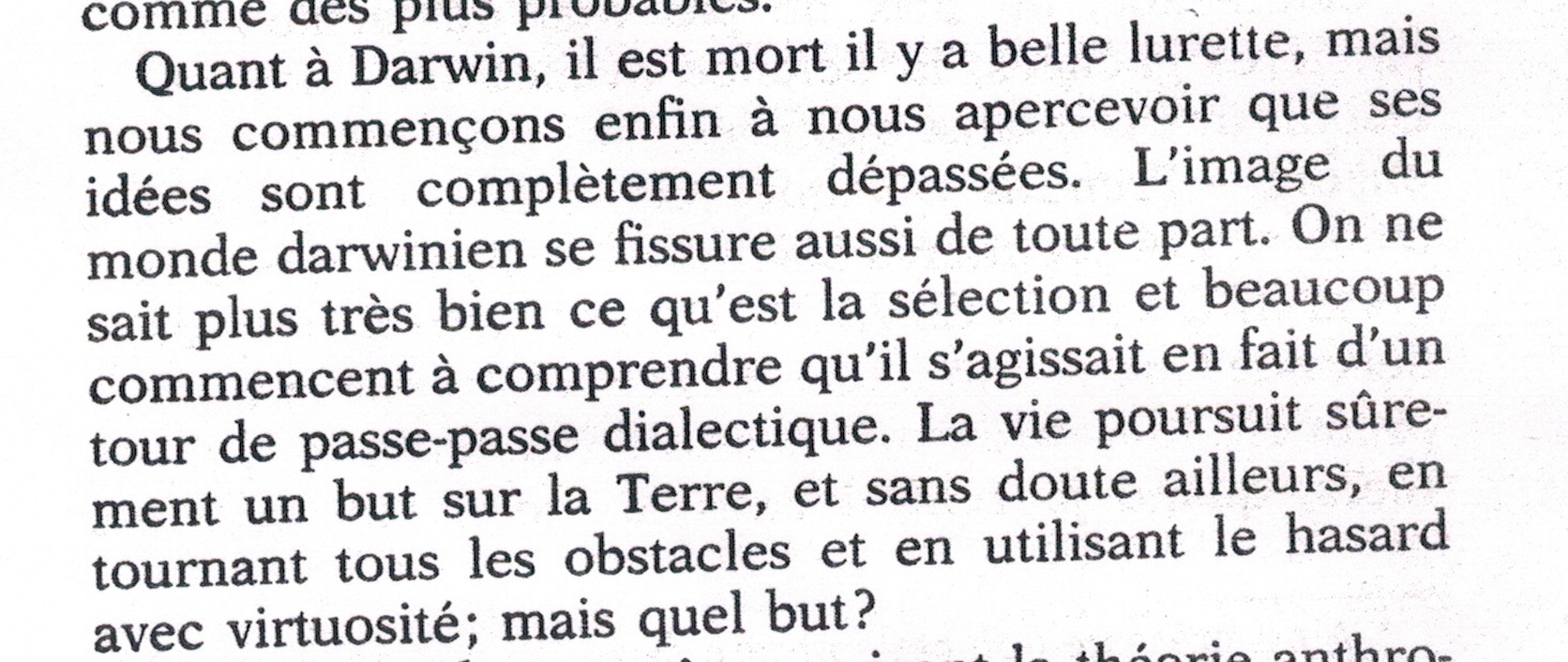 On y parle peu des fourmis, surtout de l'origine de la vie et du "grand ingénieur".. Pamphlet où le prix Nobel Jacques Monod en prend pour son grade. Pour Rémy Chauvin les idée de Darwin "sont complètement dépassée." (voir)