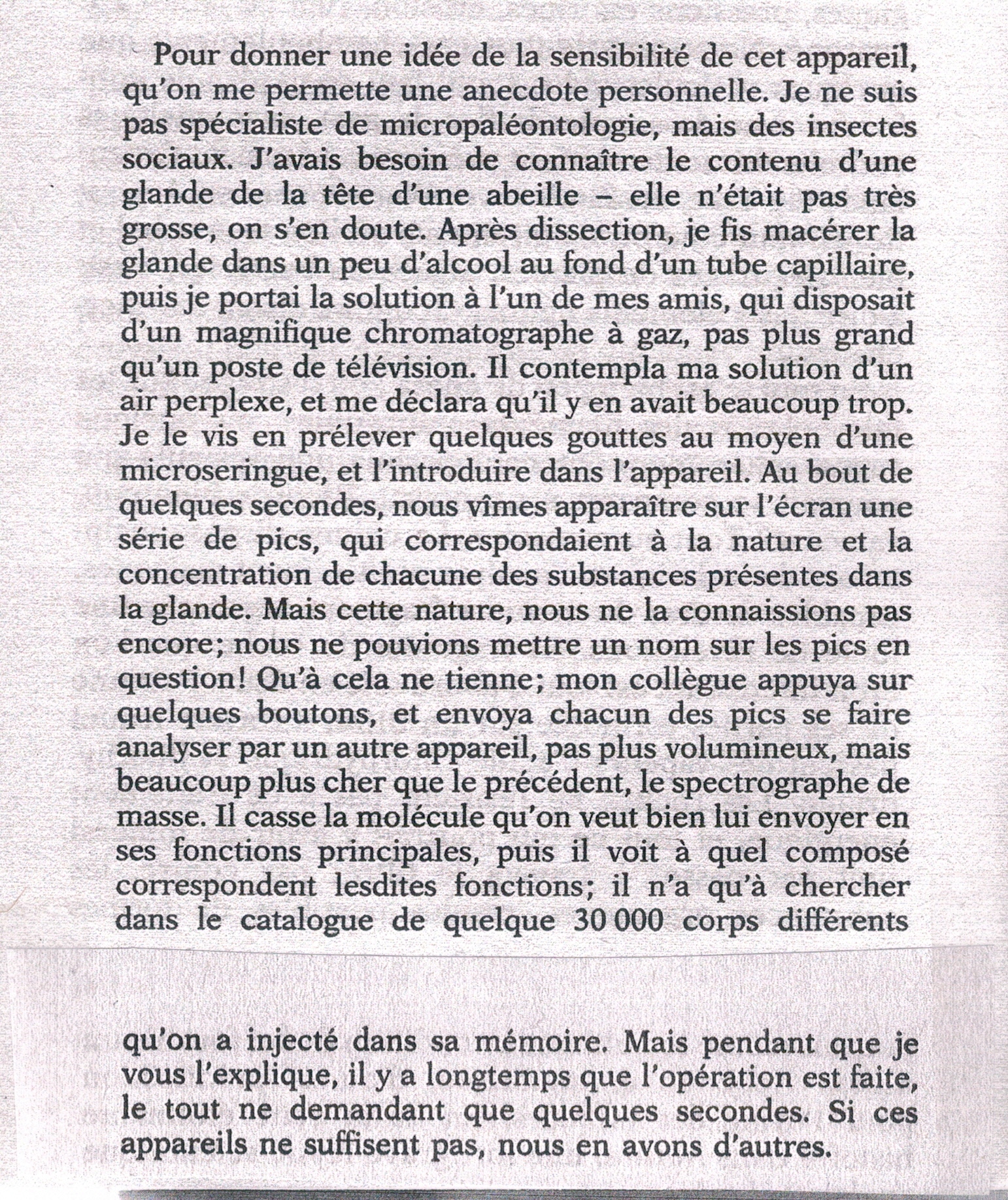 Quelques pages sur les fourmis : L'individualité de la colonie, Travail de fourmi (un peu de ses mémoires : Il explique "Pourquoi consacrer plus de quarante années d'une vie d'homme de science à un seul sujet, celui des insectes sociaux ? ... quand j'ai entrepris d'étudier les fourmis.. j'aimais ces petits monstres.. ".), Loméchuse, Epimyrma, Douve, la découverte du spectre de masse, la construction du nid chez les fourmsi rousses "L'horreur des creux". Il a aussi simulé sur ordinateur la construction du nid et déjà compris qu'il suffisait de trois règles simples et que les fourmis n'ont pas besoin de communiquer.. (Voir Le hasard fait bien les choses), Le tunnel que personne n'a creusé où il explique que le travail d'équipe n'en est pas un, et que le travail semble être du gaspillage Eloge du gaspillage. Il parle de son admiration pour von Frisch (p. 77-77), de la découverte de la phéromone royale par Mlle Pain et Michel Barbier à Bures sur Yvette, qui n'obtinrent aucune récompense des instances officielles du CNRS" (p. 78-79). Il explique qu'ils ont découvert que les abeilles étaient pleines d'antibiotiques (p. 80). Encore avant-gardiste .. Il a été surpris et émerveillé par sa découverte de la colonie géante de fourmis rousses dans le Jura avec Daniel Cherix (p. 243) et il signale que Claude Torossian en aurait découvert une autre plus grande dans les Pyrénées (à vérifier !)