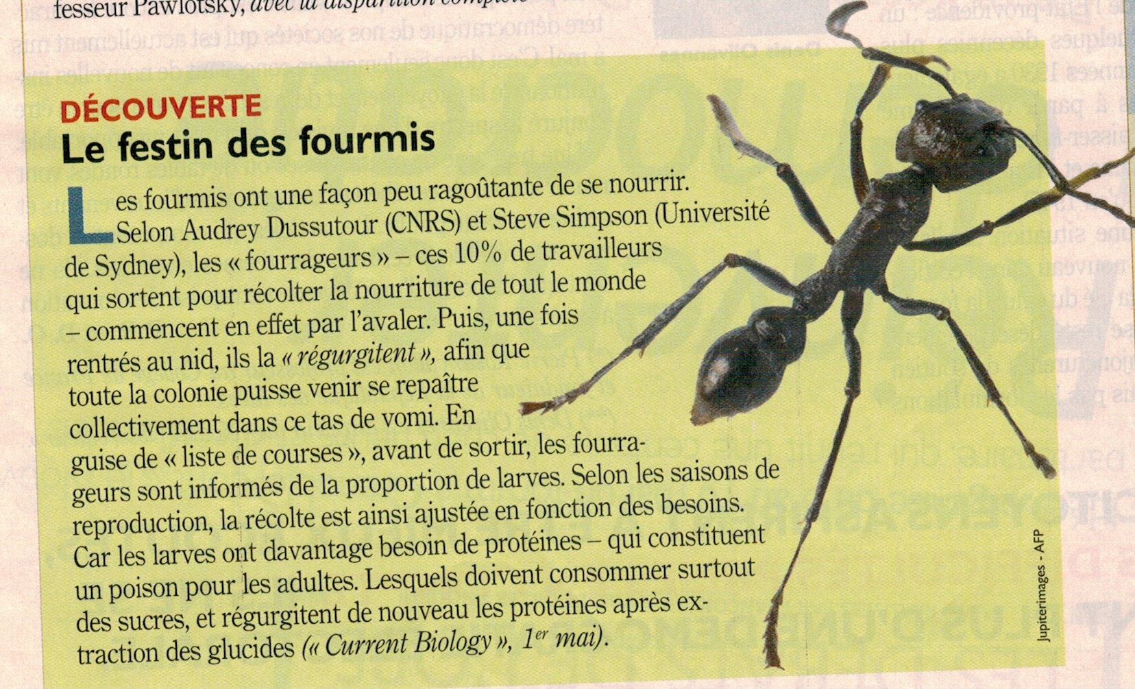 - CNRS (2009) L'estomac collectif des fourmis. 1er mai 2009, p. https://www.techno-science.net/actualite/estomac-collectif-fourmis-N6567.html.