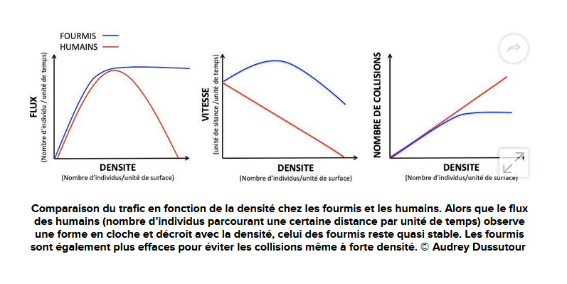 L'art d'éviter les collisions. Si les fourmis sont si habiles, pourquoi ne continuent-elles pas d'accélérer ? Parce que la fourmi est stratège ! Quand il devient trop difficile de se croiser sans se rentrer dedans, “elle préfère éviter les collisions, coûteuses en temps, plutôt que de continuer d’accélérer”. En effet, “à chaque collision, elles perdent un quart de secondes”, décrit la chercheuse. Et tout en adaptant sa vitesse, la fourmi se cache parfois derrière ses congénères “pour que celle de devant prenne le choc”. Pas très sympa, mais efficace. De fait, “le nombre de collisions entre fourmis n’augmente pas alors que leur densité et leur vitesse augmente”. On imagine le résultat sur un groupe d’êtres humains, piétons ou automobilistes. Une nouvelle preuve de “l’efficacité de l’intelligence collective et distribuée” pour Audrey Dussutour. “Aucune fourmi n’a la solution, ce sont les interactions entre fourmis qui font émerger la solution”, et ce, sans règles prédéfinies : "L’anarchie fonctionne bien chez les fourmis ! Cette flexibilité, c’est ce qui explique en partie la dextérité de la gestion routière des fourmis. Sur la route des vacances, l’encombrement des quatre voies vers les plages du sud piège souvent les automobilistes dans des bouchons interminables, tandis que les voies inverses sont quasiment vides. Alors qu'on trépigne dans notre habitacle, “chez les fourmis, on aurait réquisitionné les voies en sens inverse”, compare la chercheuse. autrement dit, une fourmi ne s’arrêterait à un feu rouge que s’il y a vraiment un piéton, l'automobiliste, lui, doit respecter le code de la route, et l'organisation spatiale qui lui est imposée."