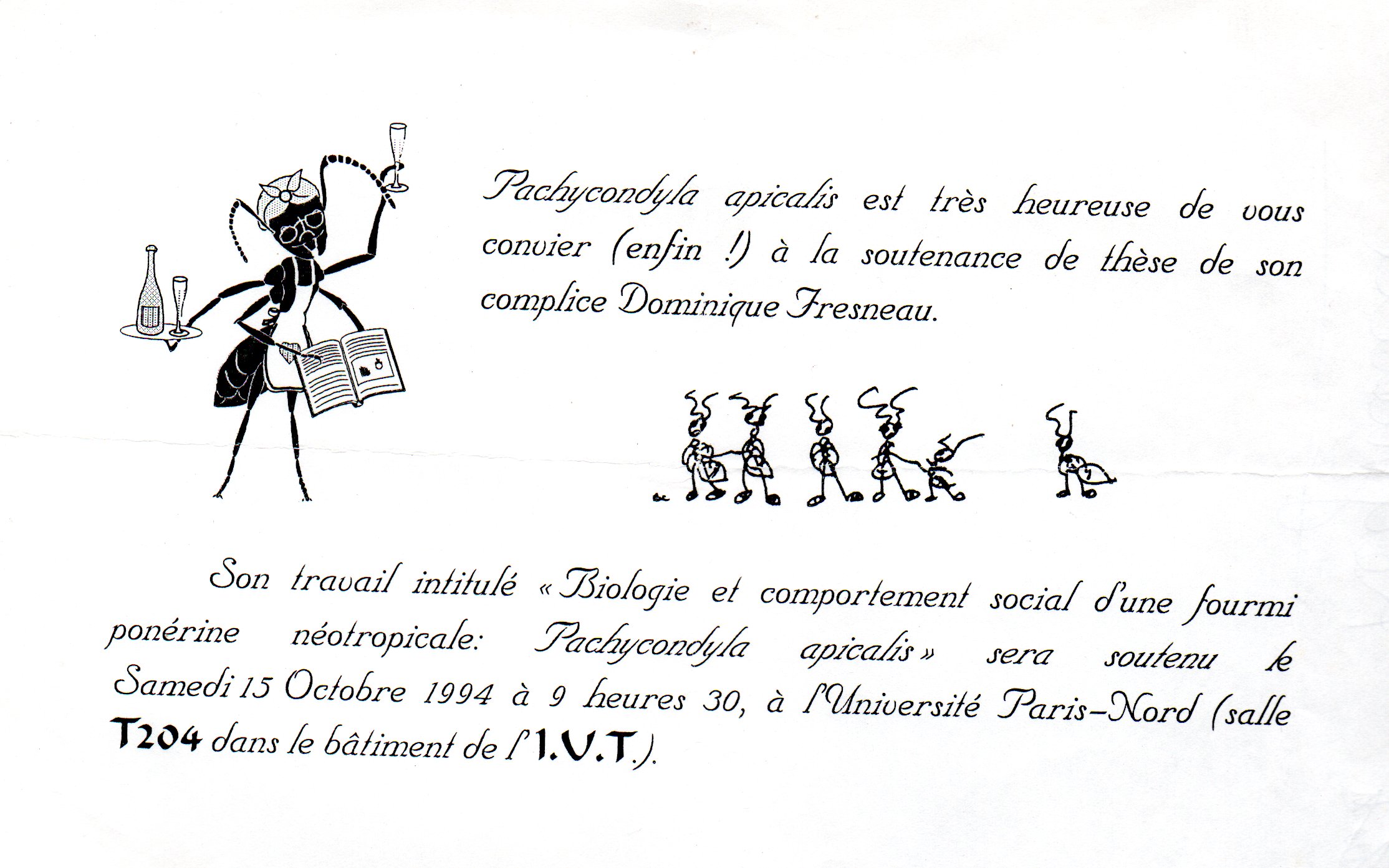 Thèse de doctorat d'Etat : Biologie et comportement social d'une fourmi ponérine néotropicale (Pachycondyla apicalis), Université Paris Nord (1994). Sous la direction de Pierre Jaisson.