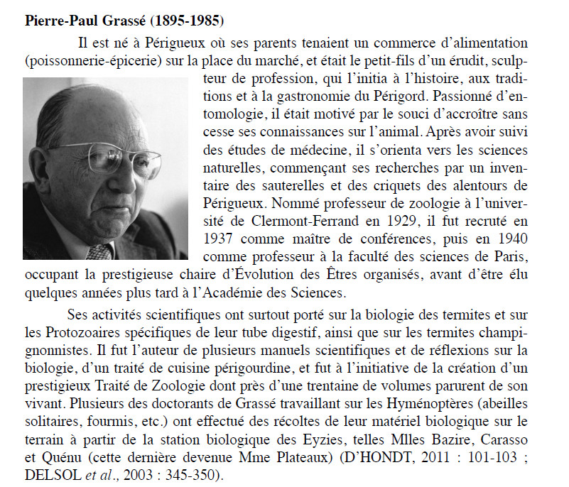Voir Interview de Cécile Plateaux-Quénu sur sa thèse : "en 1951-52 au Laboratoire d’Evolution des Etres organisés, Pierre Paul Grassé règne en souverain. Il enseigne de manière très vivante et stimulante pour les jeunes : « la biologie en est aux balbutiements ». Stupeur et espoir : il reste peut-être quelque chose à faire par là. Vers la fin de l’année scolaire, il se rend en personne en salle de travaux pratiques et questionne les étudiants : « Y en a-t-il parmi vous qui s’intéressent à la recherche ? »"