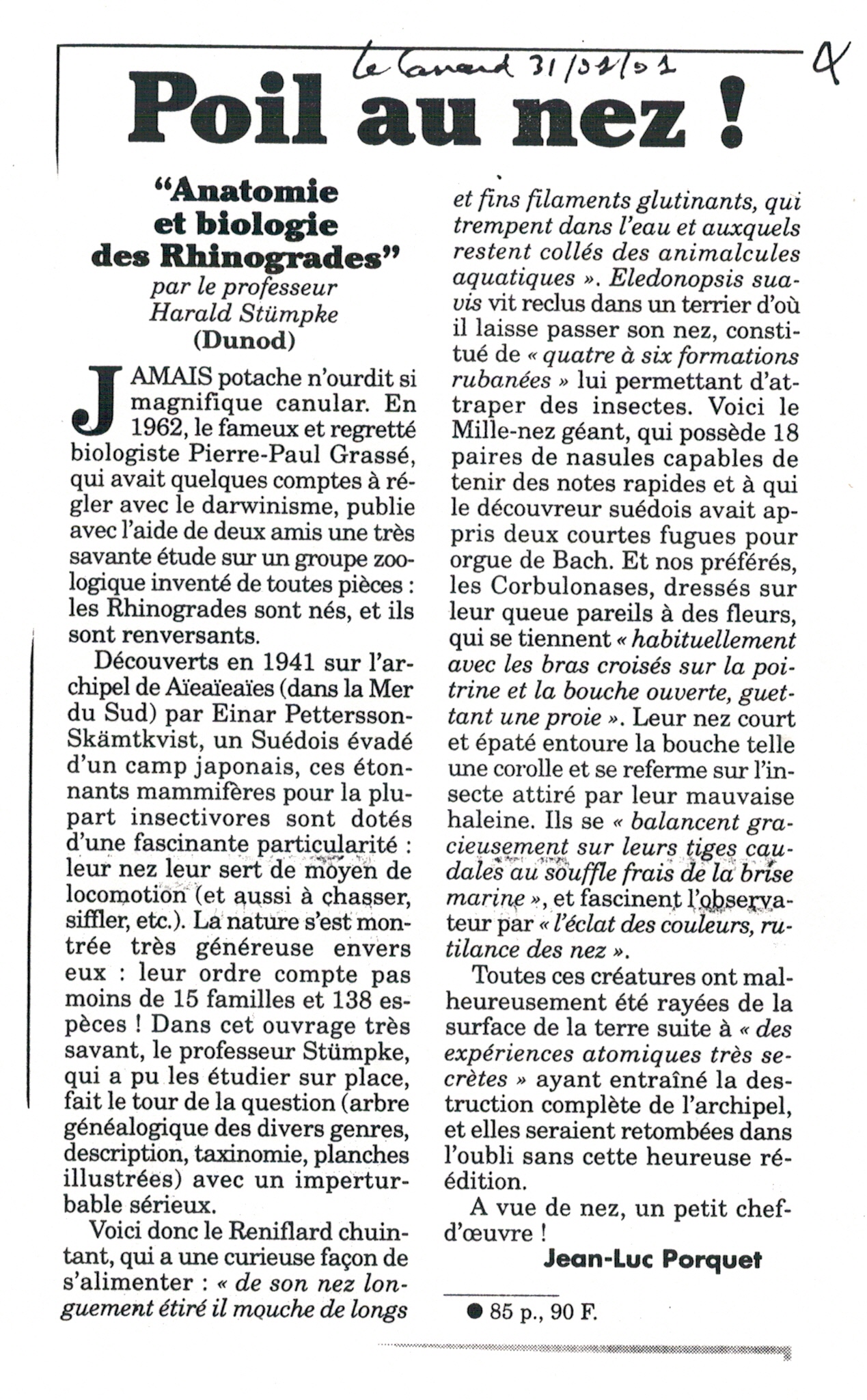 "En 1962, le fameux et regretté biologiste Pierre-Paul Grassé, qui avait quelques comptes à régler avec le darwinisme, publie avec l'aide de deux amis une très savante étude sur un groupe zoologique inventé de toutes pièces : les Rhinogrades sont nés, et ils sont renversants." (Jean-Luc Porquet, Le Canard Enchaîné 31 janvier 2001). Voir Poil au nez. Oui, Grassé était néo-lamarckien et très antidarwinien et donc anti-sociobiologiste (voir "La termitière totalitaire") comme on peut encore le voir à Apostrophe en 1981 contre la sociobiologie de Wilson (Voir archives de l’INA).