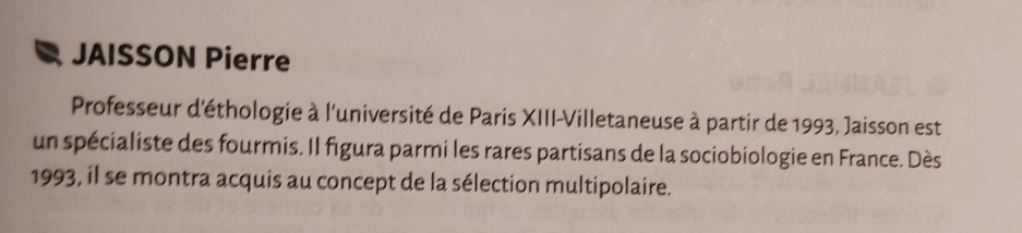- Le Pr Jaisson, auteur de "La fourmi et le sociobiologiste" "N'ayons plus peur de la sociobiologie, elle n'est ni raciste ni d'extrême droite", L'évenement du jeudi, 23-29 décembre 1993, n°477, p. 79-81. Pdf