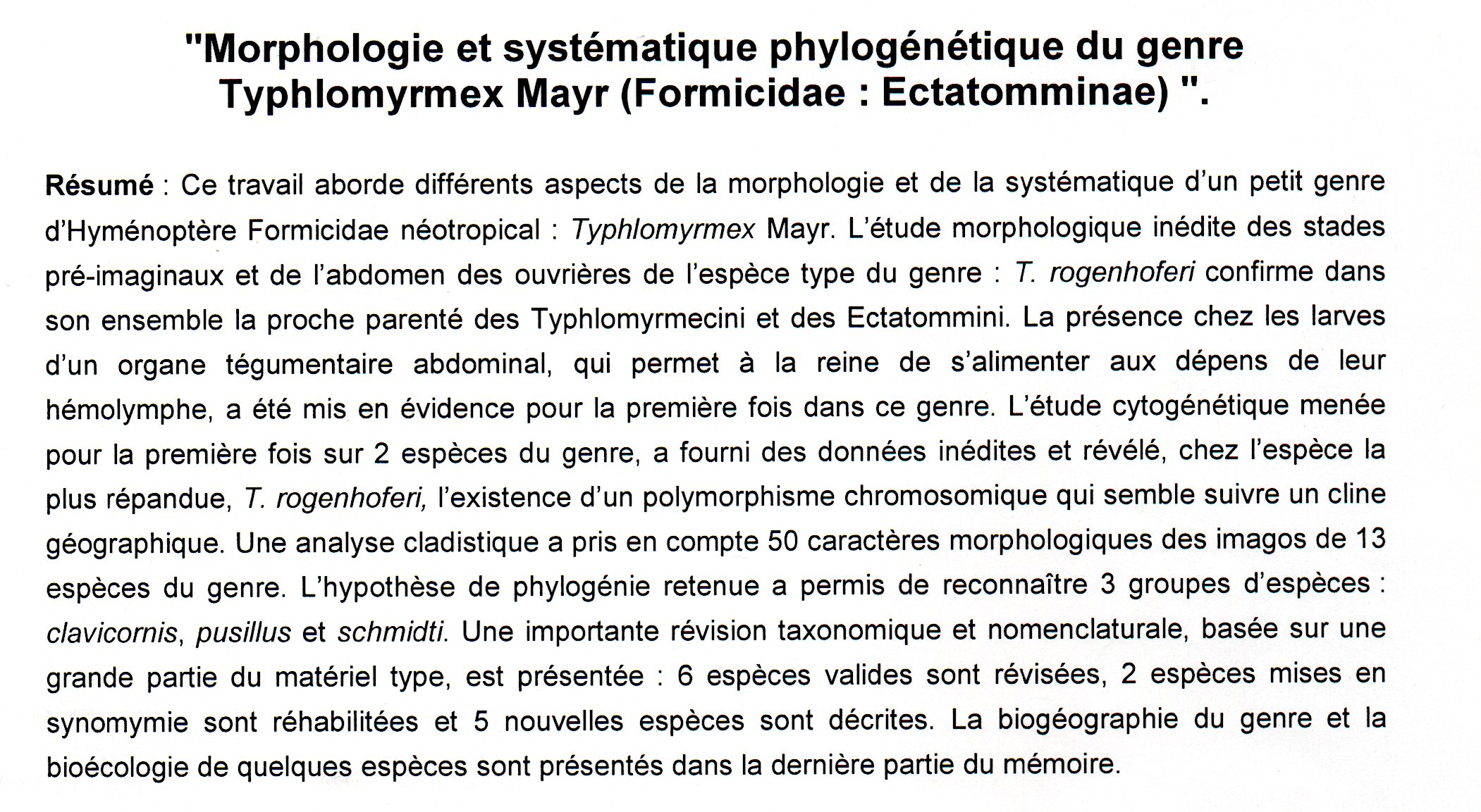 Thèse : Morphologie et systématique phylogénétique du genre Typhlomyrmex Mayr, 1862 (Formicidae : Ectatomminae), 2005. Muséum National d'Histoire Naturelle, sous la direction de Claire Villemant. Le président du jury était Dominique Fresneau. Le jury était composé de Donat Agosti, André Nel. Les rapporteurs étaient Alberto Tinaut, Jacques Delabie.