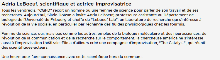 Adria Leboeuf, scientifique et actrice-improvisatrice, interview de 32 min sur rts.ch