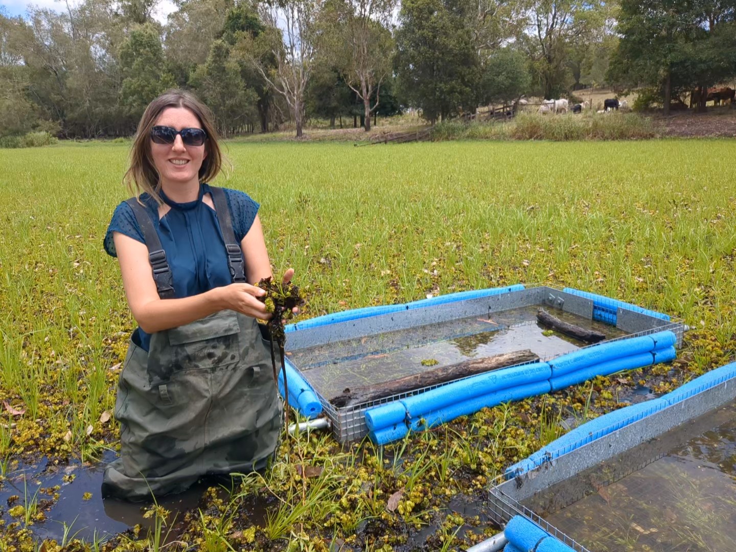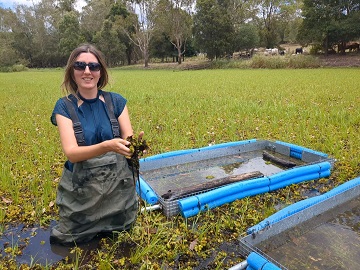 En train d’aider un collègue à collecter des charançons pour la lutte biologique de la mauvaise herbe aquatique Salvinia.