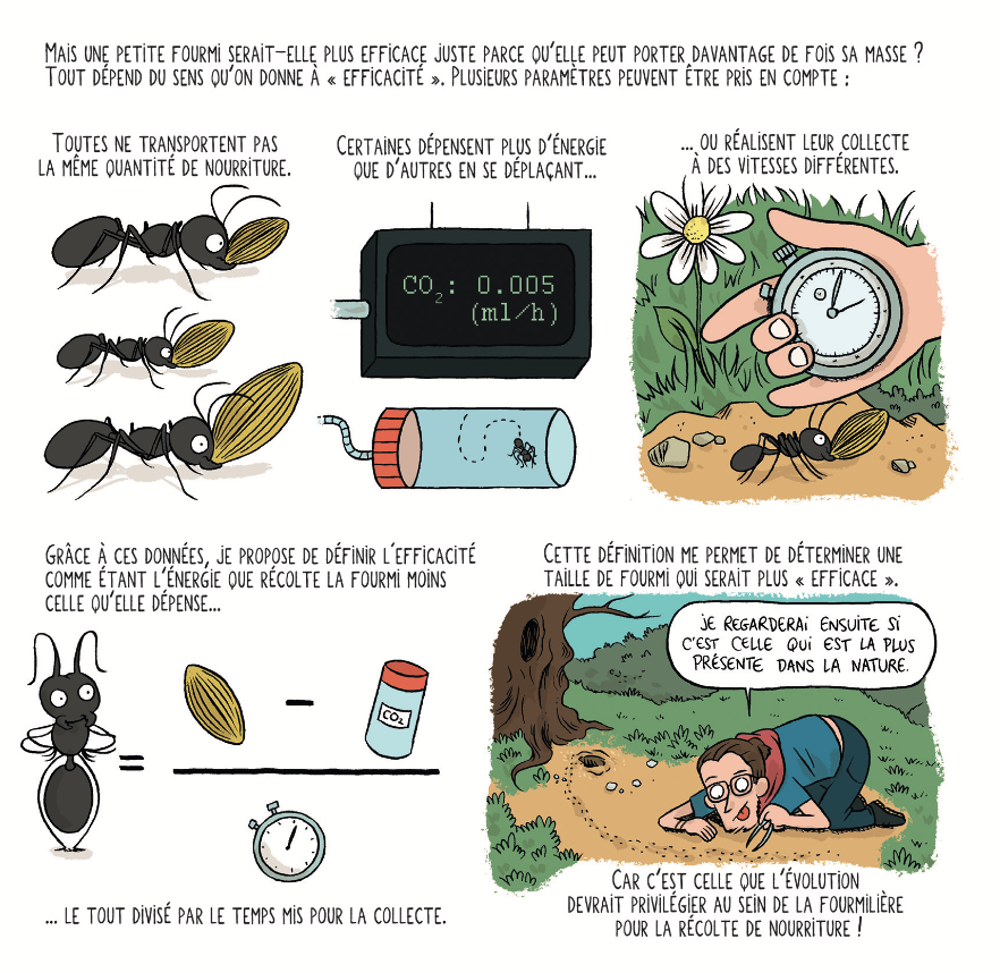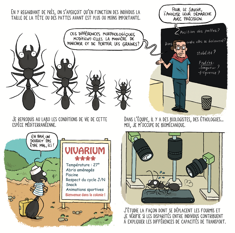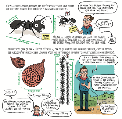 Dans la BD « Sciences en bulles » il y a un article Elles portent dix fois leur masse ! (8 octobre 2019) par Hugo Merienne dans le cadre de la science en fête 2019. Il étudie les performances individuelles de Messor barbarus, qui "comporte des ouvrières de tailles très variées, entre deux et quinze millimètres ! Leur taille a-t-elle une incidence sur la masse des charges qu’elles peuvent transporter ? Ont-elles plusieurs types de stratégies ? Y a-t-il des ouvrières plus efficaces que d’autres ? Et que signifie « efficacité » dans un tel contexte ?" Voir Force des fourmis